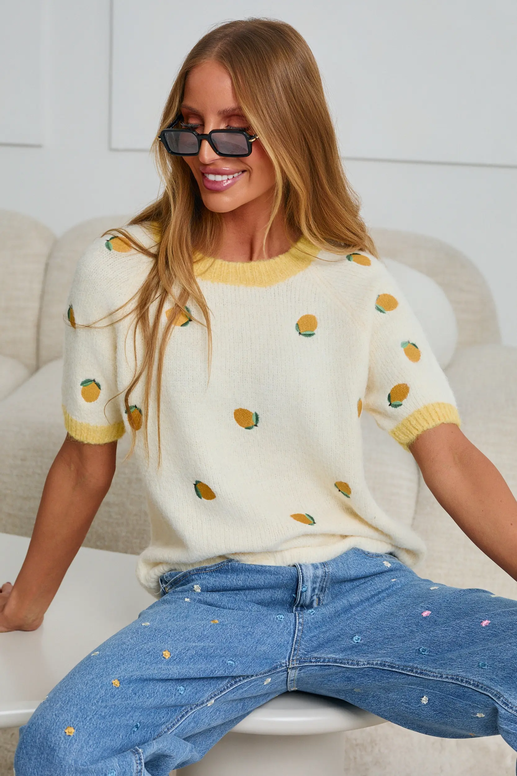 SWETER Z KRÓTKIM RĘKAWEM Z HAFTOWANYMI CYTRYNAMI