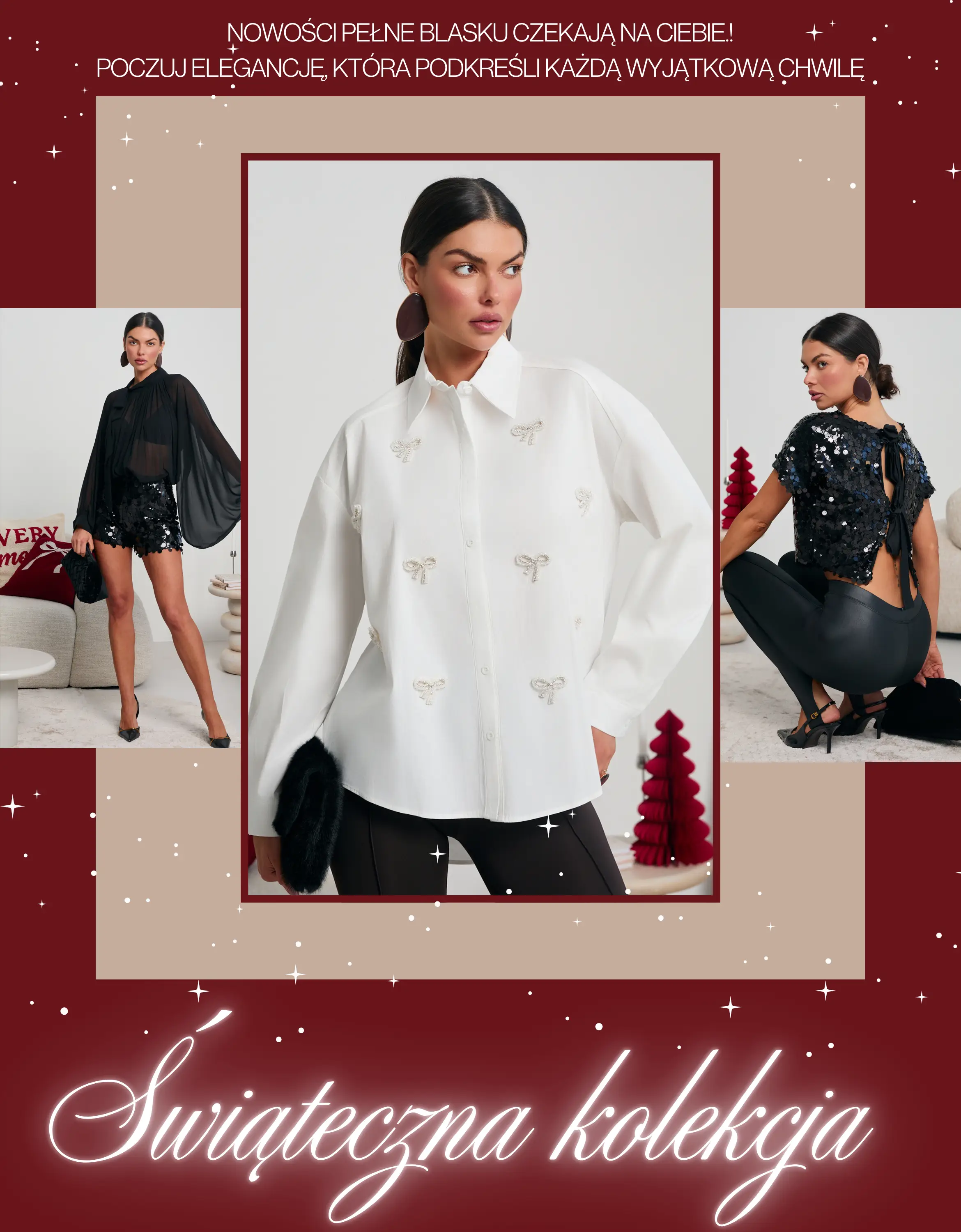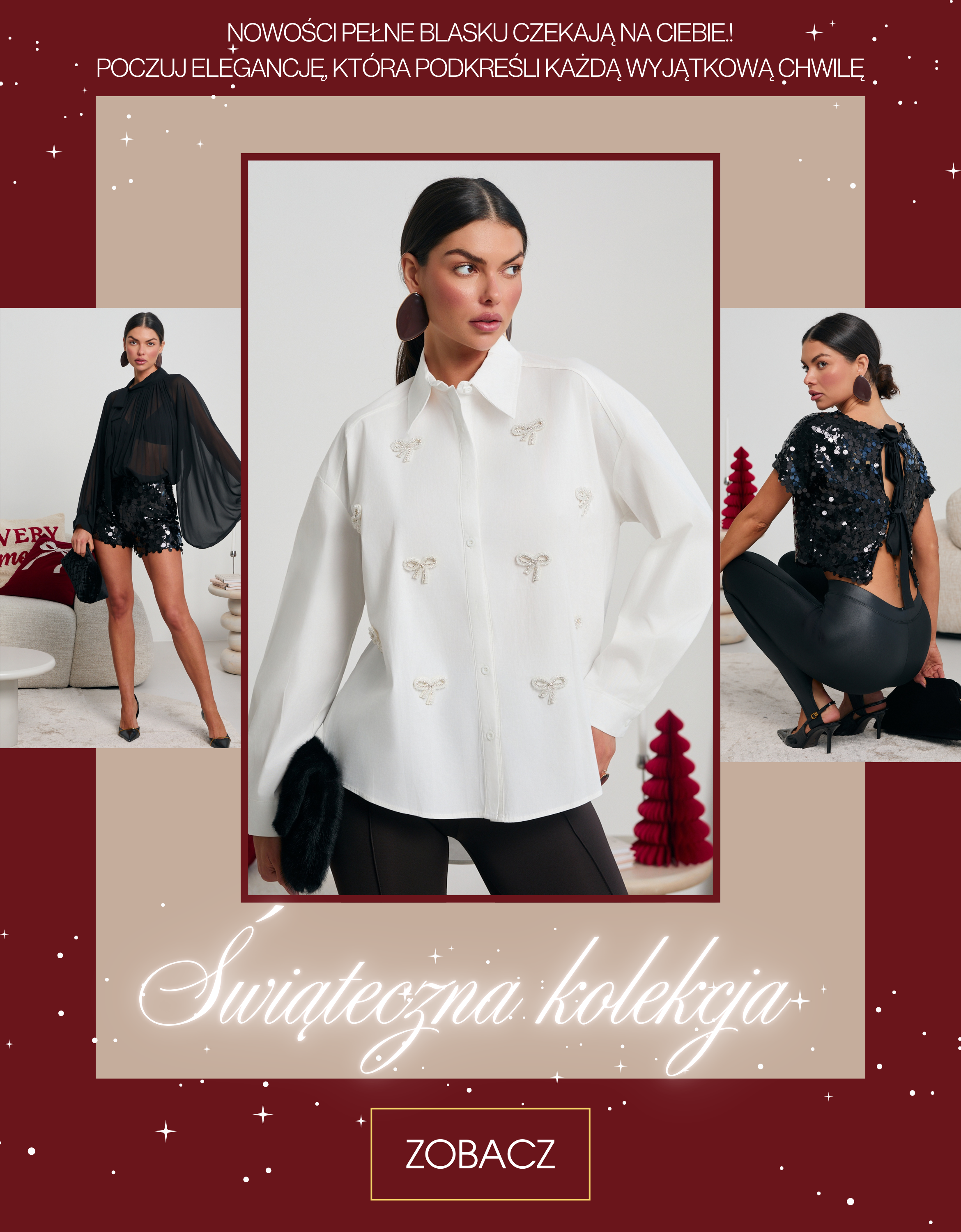 Ta świąteczna stylizacja łączy elegancję z nowoczesnym twistem. Koronkowe body dodaje zmysłowej lekkości, krótka marynarka z podkreślonymi ramionami nadaje całości strukturę i pewność siebie, a mini z eko skóry wprowadza efektowny, modny połysk. To idealny zestaw dla kobiet, które w świątecznym sezonie chcą zachwycać — stylowo, odważnie i z klasą!