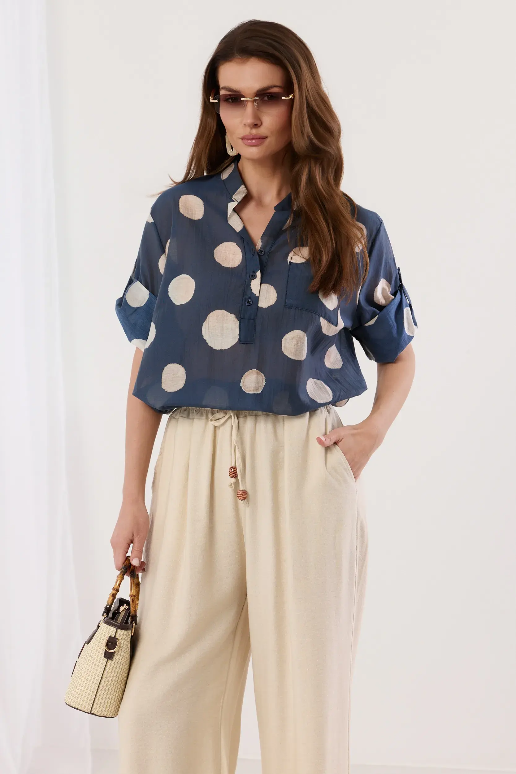Bluzka o luźnym kroju wykonana z lekkiej i zwiewnej tkaniny o półtransparentnym wykończeniu. Model z kołnierzykiem typu stójka i dekoltem w serek zapinanym na guziki ukryte pod plisą. Krótki rękaw z możliwością podwinięcia i zapięcia na patkę z guzikiem, co nadaje całości swobodny charakter. Naszywana kieszeń na piersi. Wyrazisty wzór w duże grochy dodaje projektowi nowoczesnej dynamiki. Prosty dół zapewnia wygodę i miękki układ materiału na sylwetce. Idealna do letnich stylizacji.