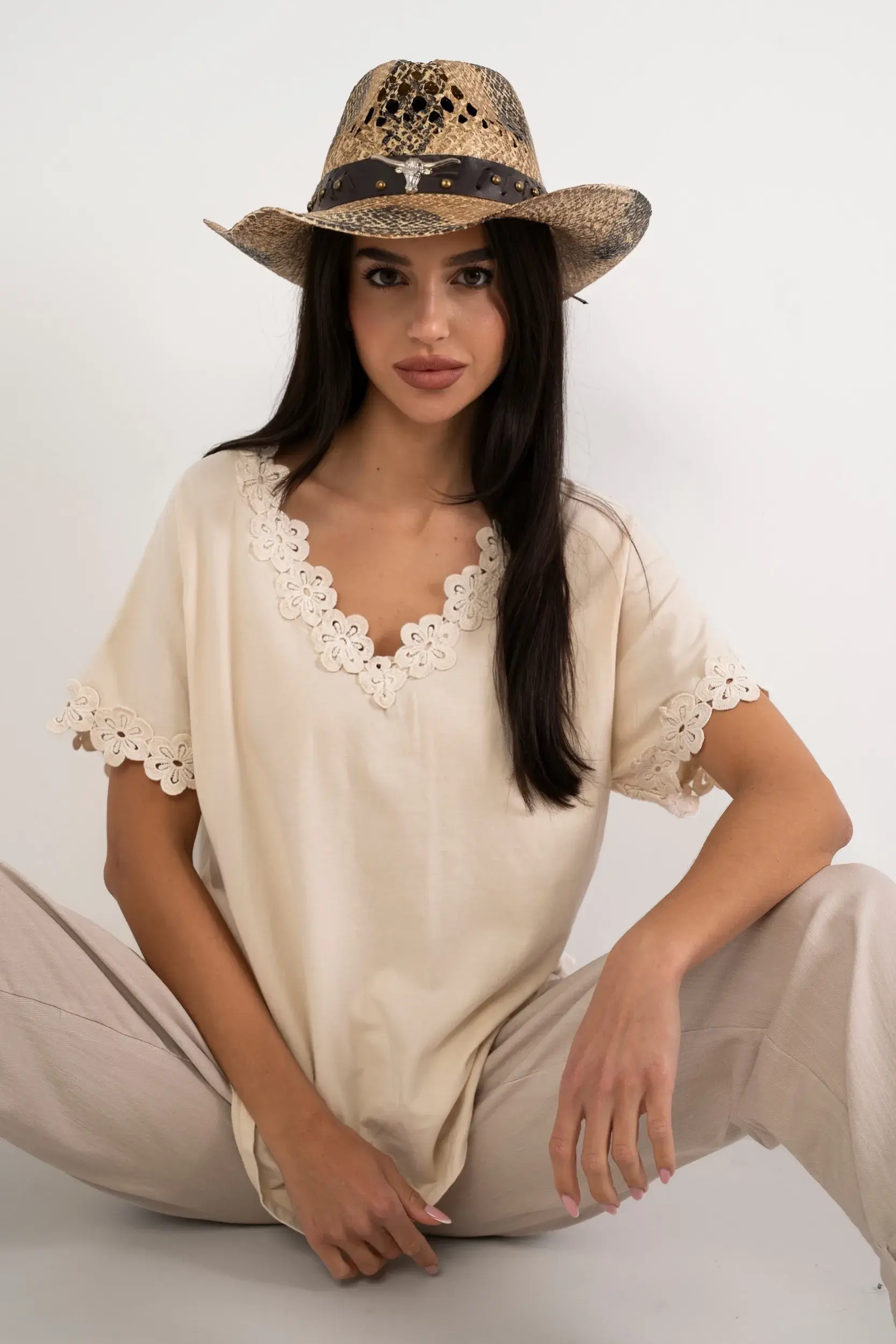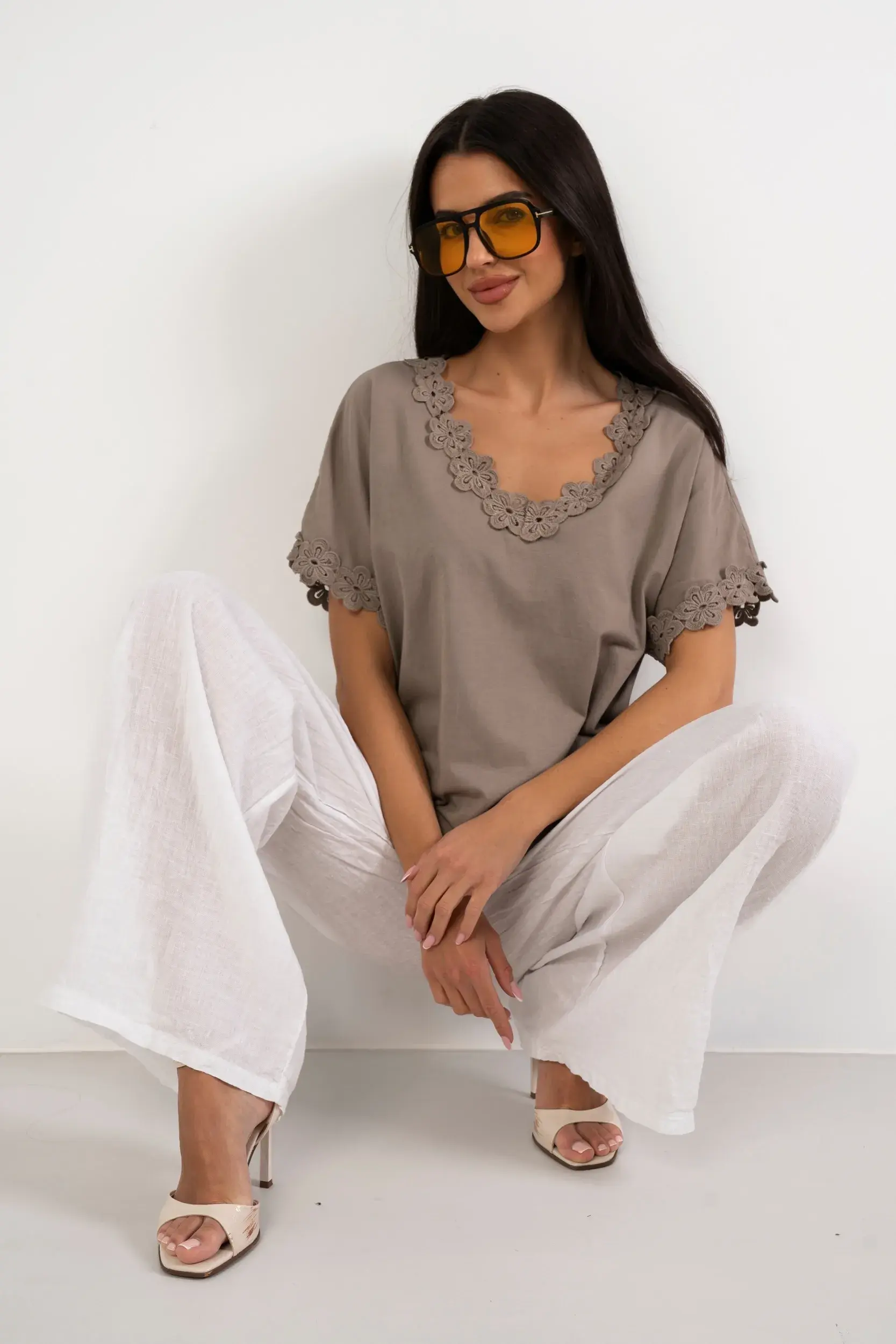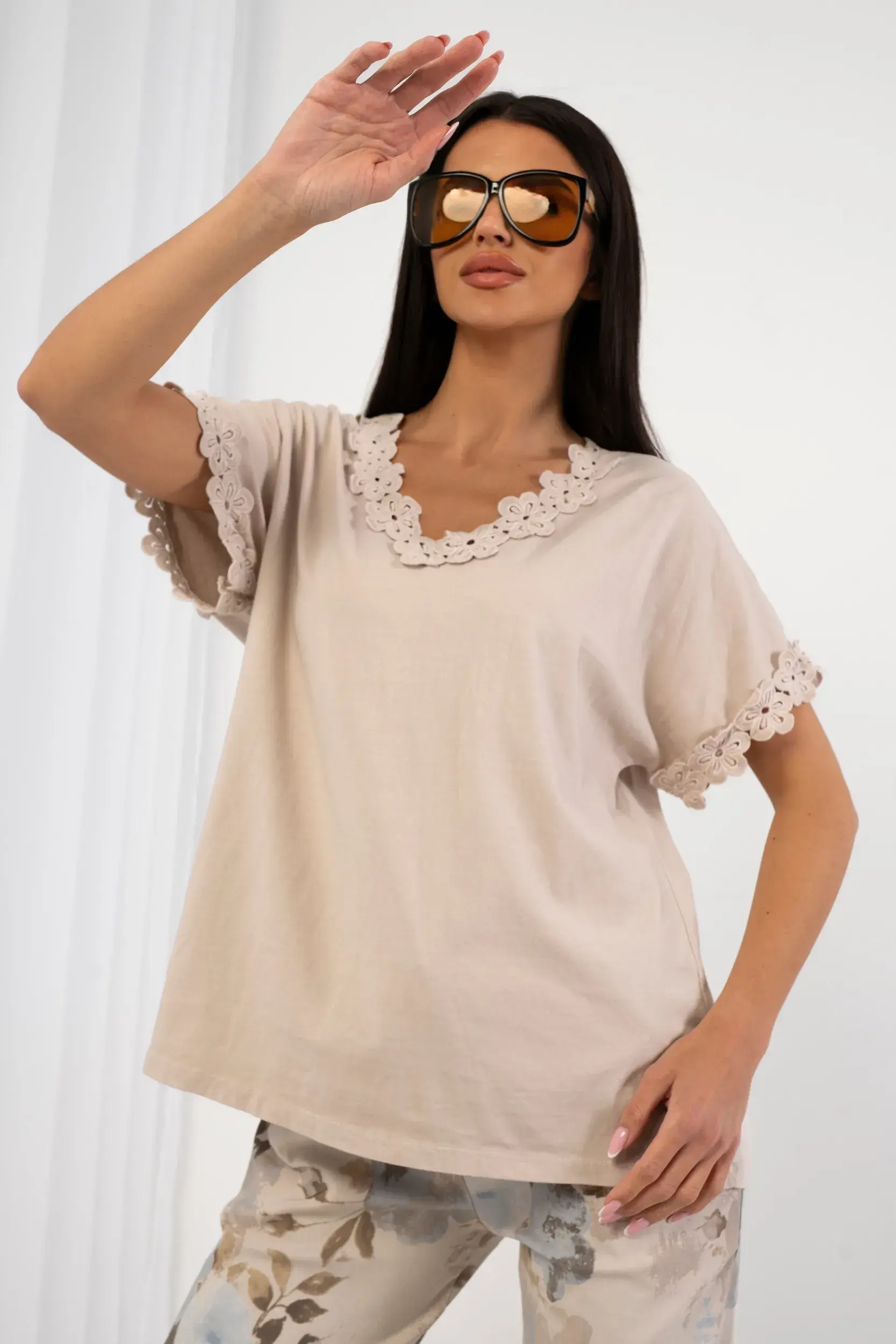 Bluzka o swobodnym kroju wykonana z miękkiej i przewiewnej dzianiny, która zapewnia wyjątkowy komfort noszenia oraz naturalny wygląd. Model z szerokim dekoltem w serek oraz krótkim rękawem o obniżonej linii ramion. Brzegi wykończone kunsztowną, ażurową aplikacją z motywem kwiatowym, która nadaje całości finezyjny charakter. Idealna propozycja do minimalistycznych, letnich zestawień z szerokimi spodniami z lnu.