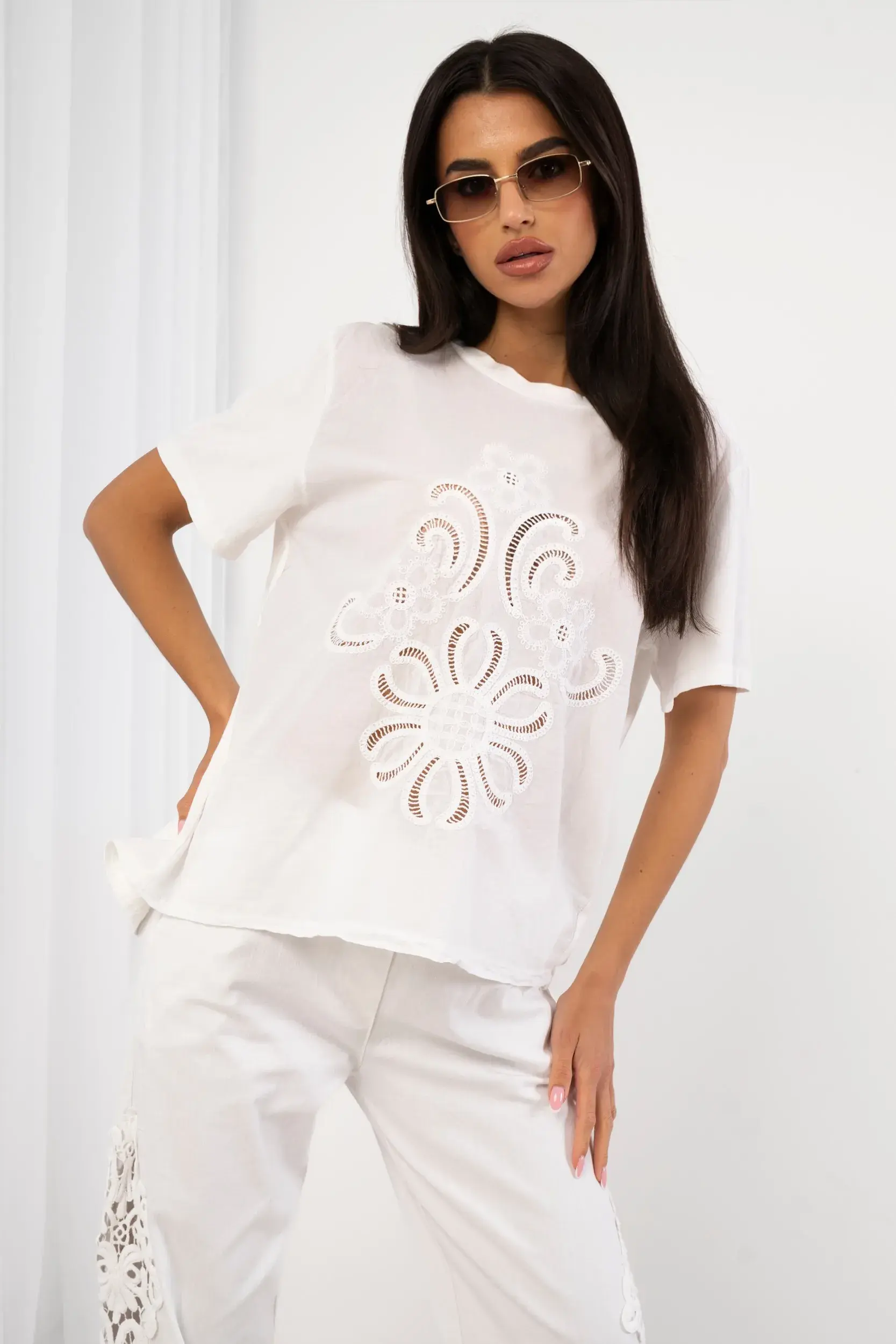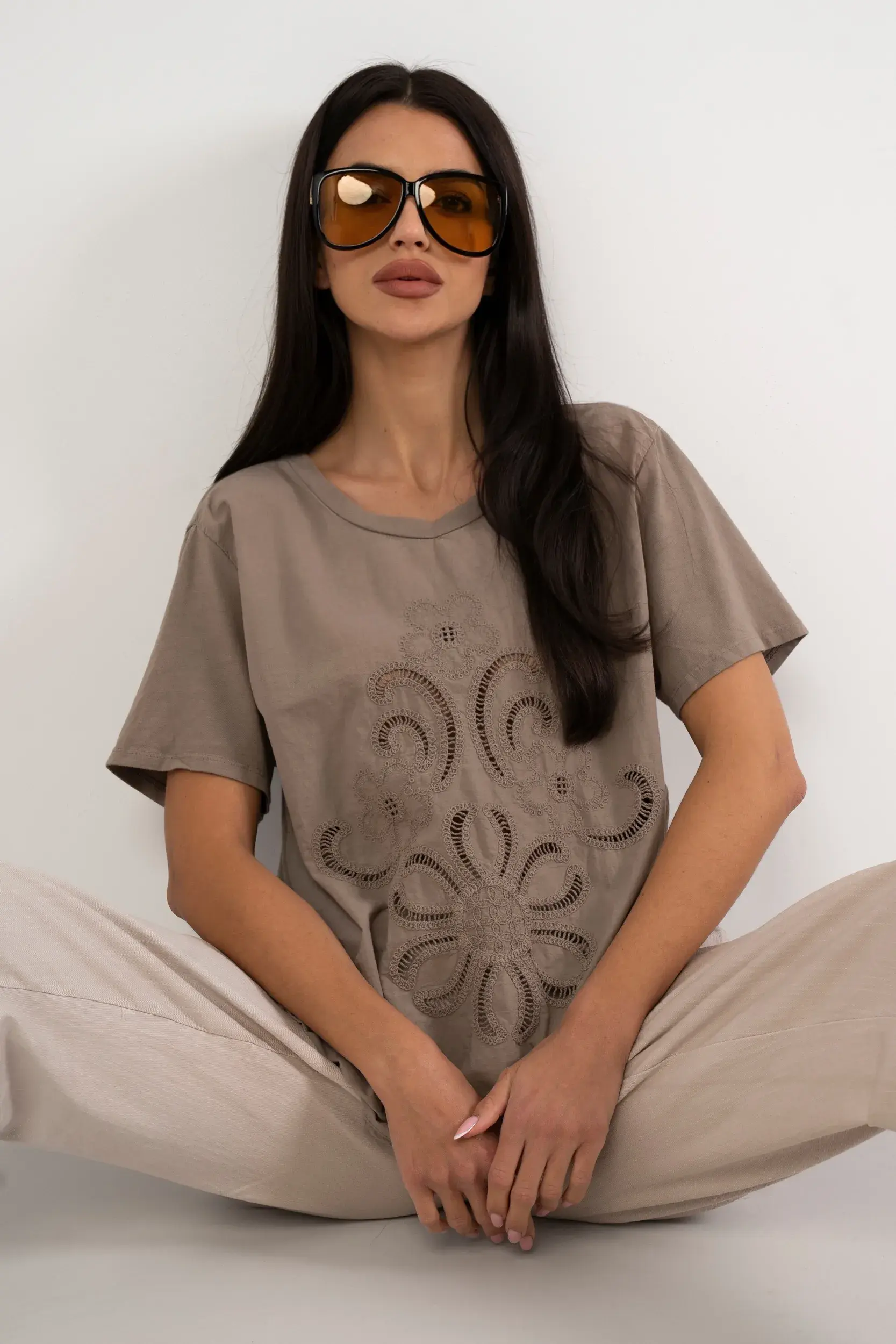 T-shirt o swobodnym kroju wykonany z lekkiej, przewiewnej tkaniny. Okrągły dekolt i krótkie rękawy o obniżonej linii ramion nadają całości nowoczesny, minimalistyczny charakter. Front zdobi kunsztowny, ażurowy haft z motywem florystycznym, który dzięki subtelnym prześwitom dodaje sylwetce lekkości i wyrafinowania. Wykończenie z dbałością o detale oraz prosta linia dołu sprawiają, że model ten idealnie wpisuje się w estetykę letniej elegancji, stanowiąc doskonałą bazę do stylizacji z lnianymi spodniami.
