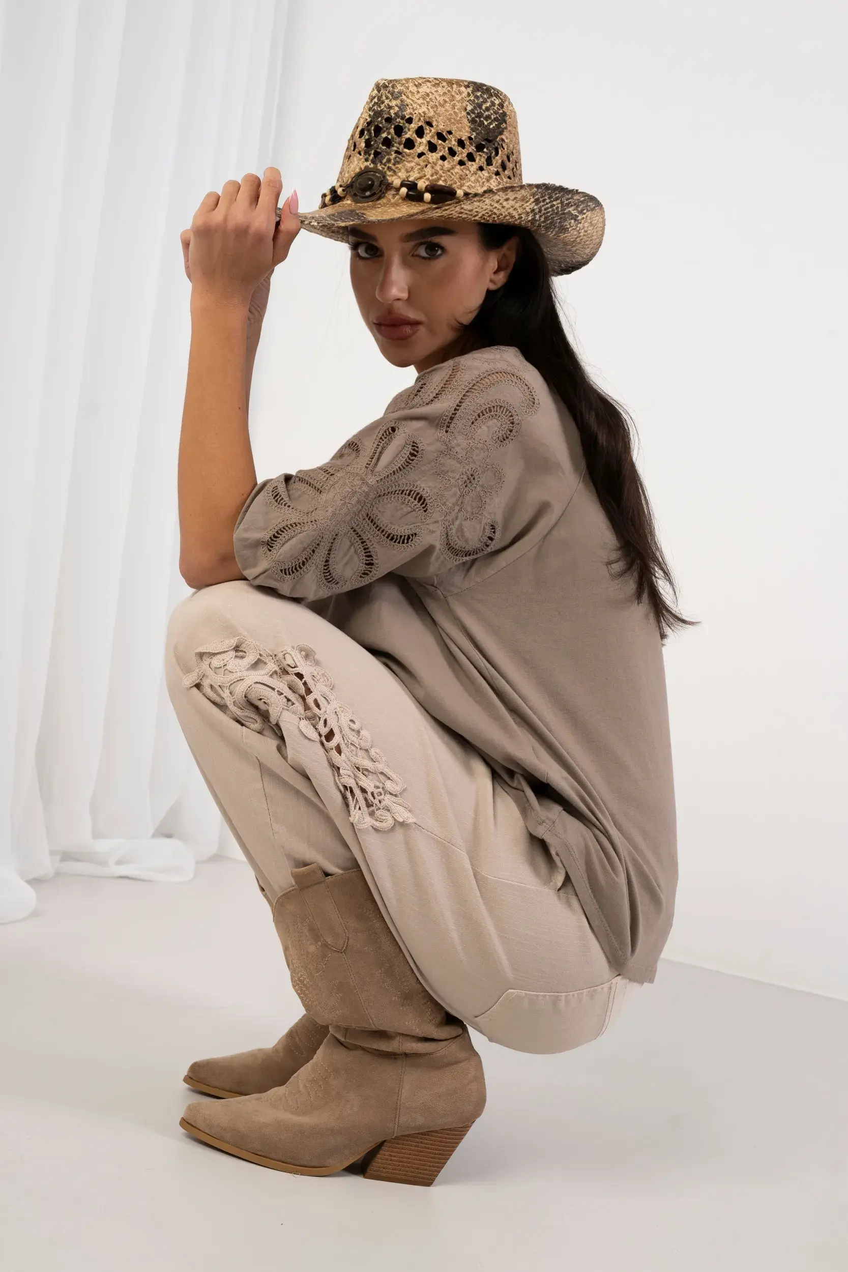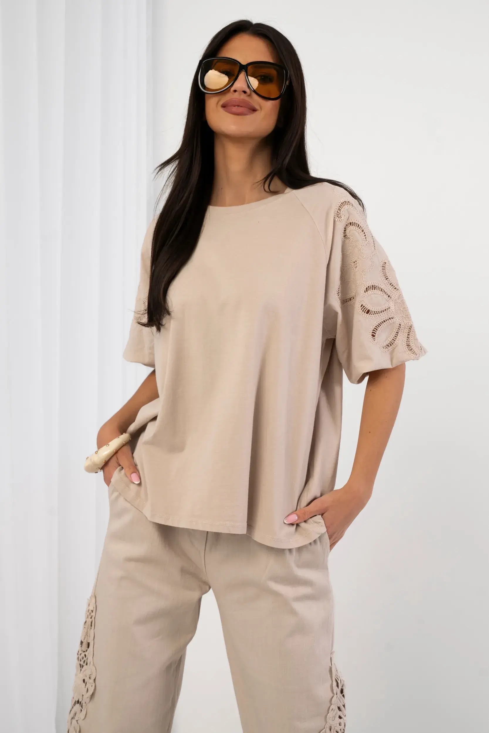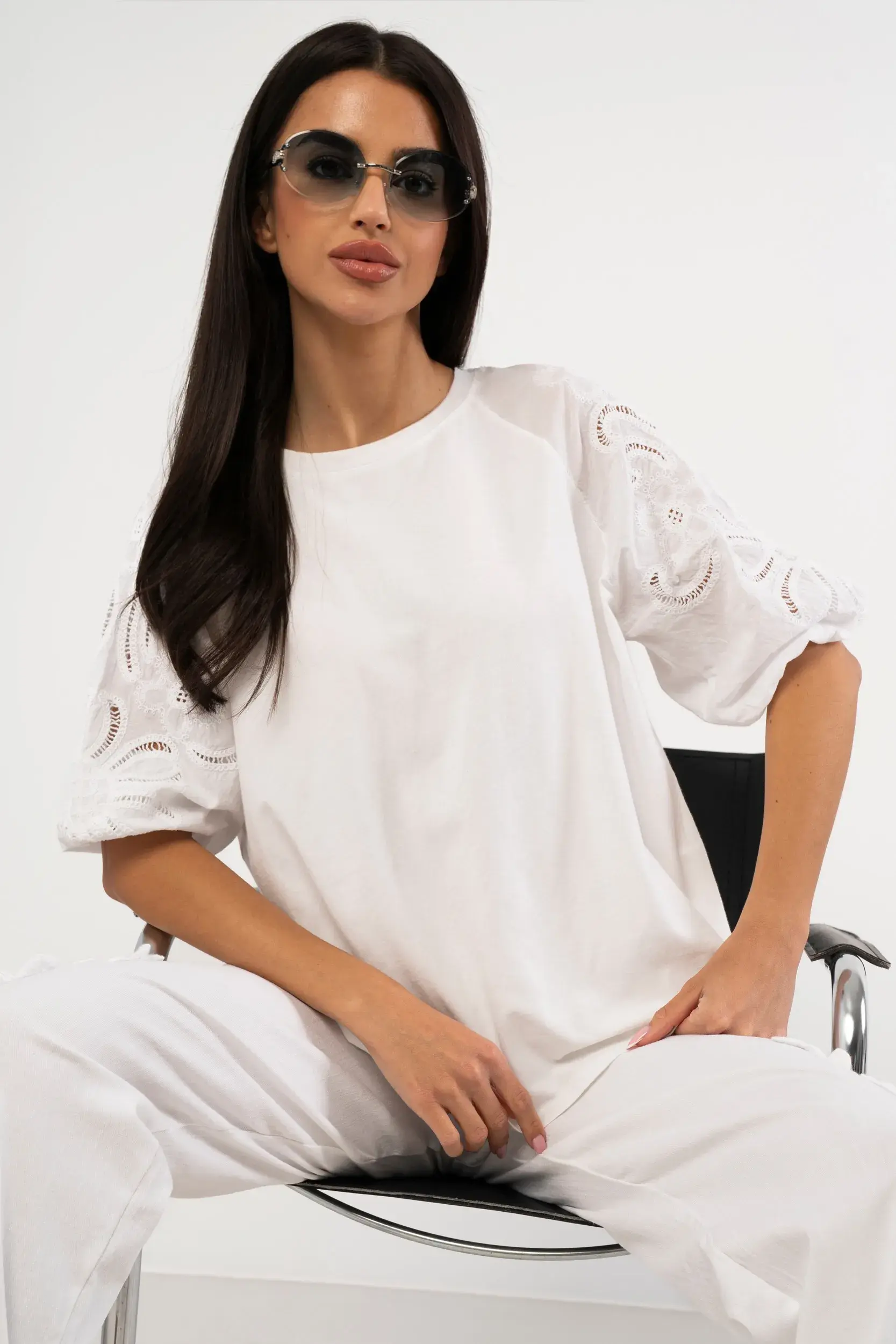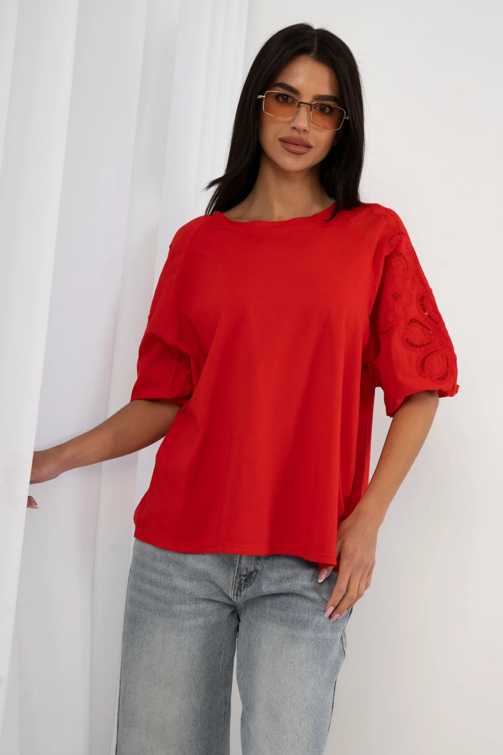 Luźna bluzka o prostym kroju wykonana z wysokogatunkowej, miękkiej tkaniny zapewniającej wyjątkowy komfort noszenia. Model wyróżnia się efektownymi, bufiastymi rękawami o długości do łokcia, które ozdobiono kunsztownym, ażurowym haftem z motywem florystycznym i dekoracyjnymi wycięciami typu Richelieu. Okrągły dekolt z subtelnym wykończeniem oraz obniżona linia ramion nadają całości nowoczesny, swobodny charakter. Idealna propozycja do minimalistycznych stylizacji wymagających unikalnego detalu.