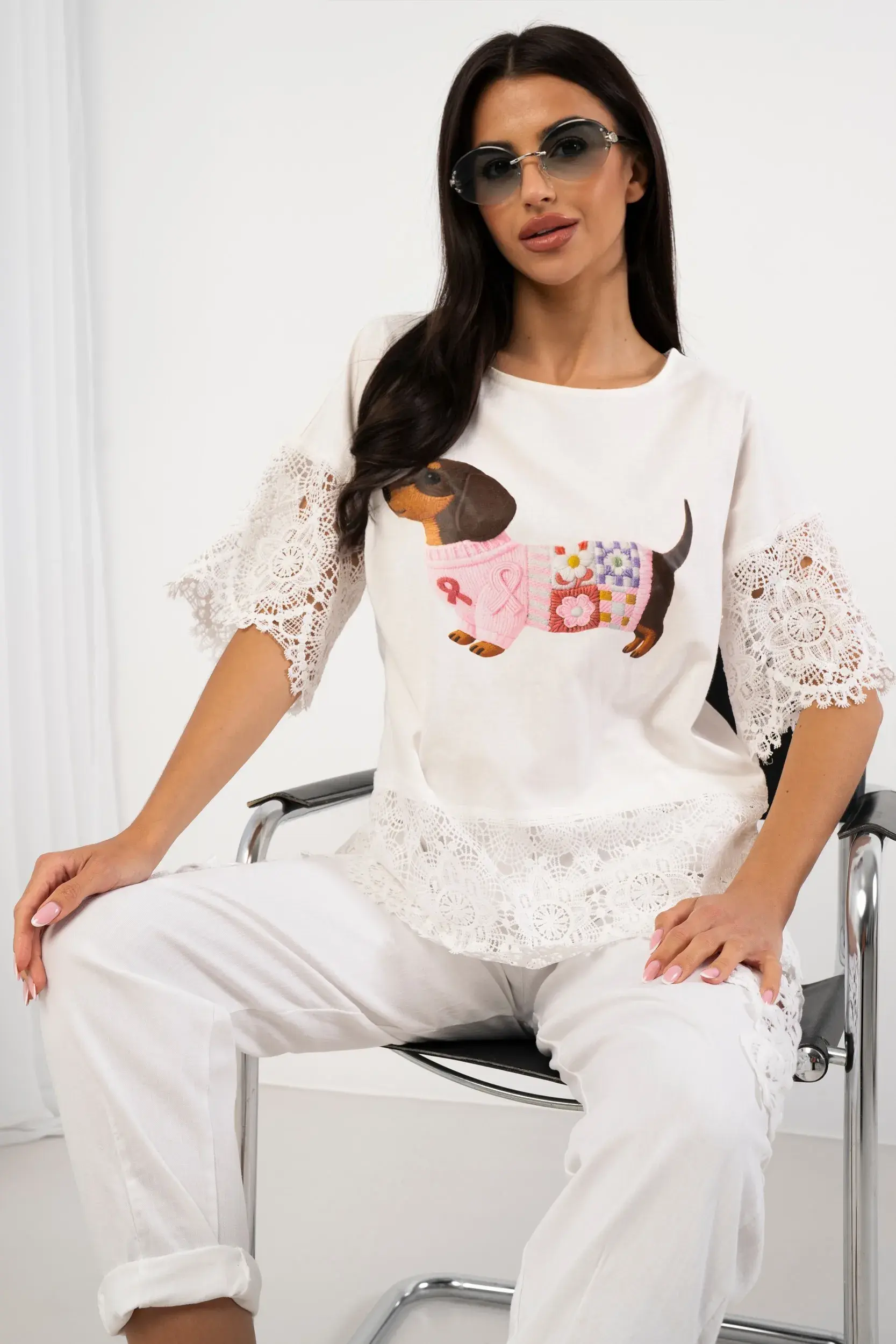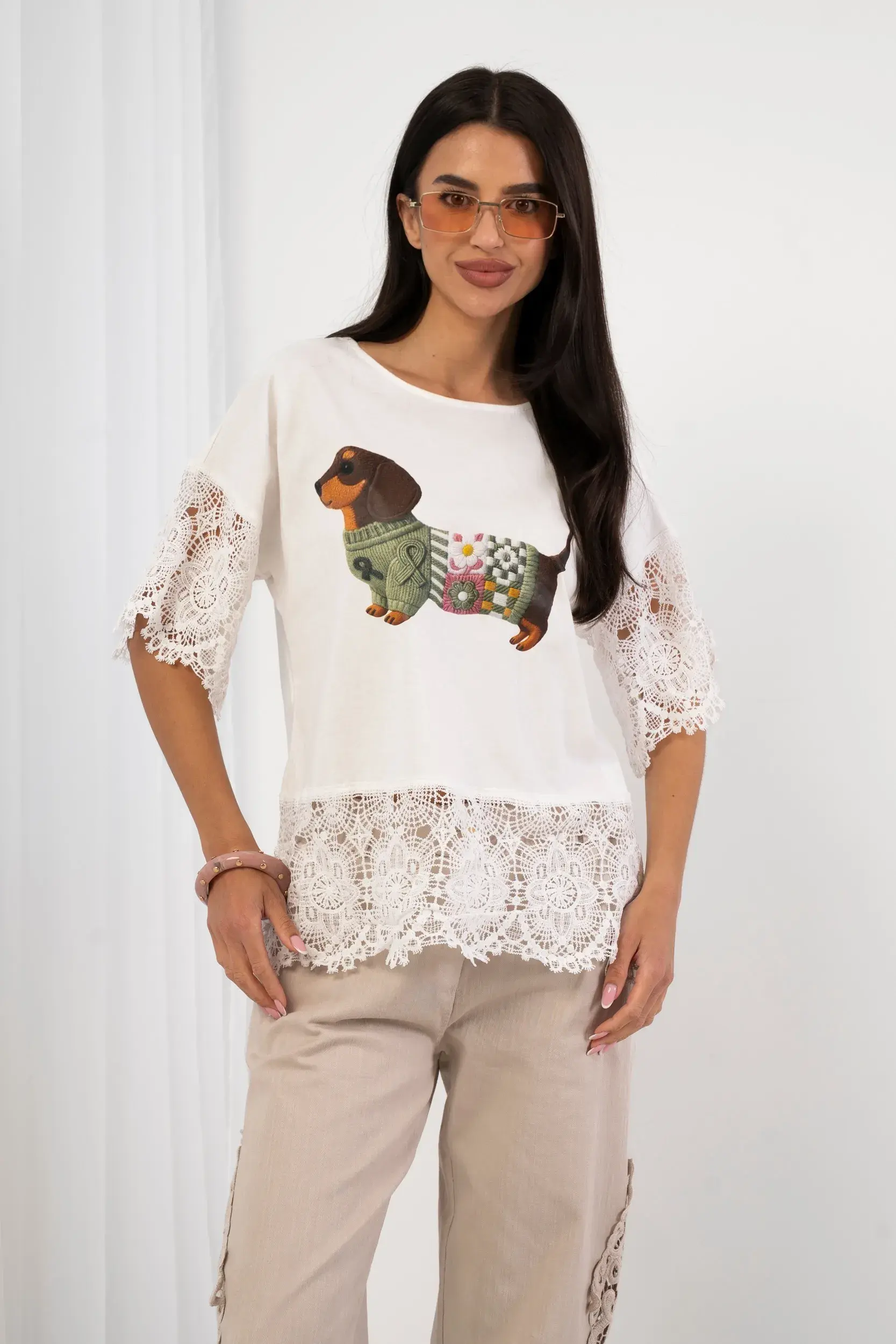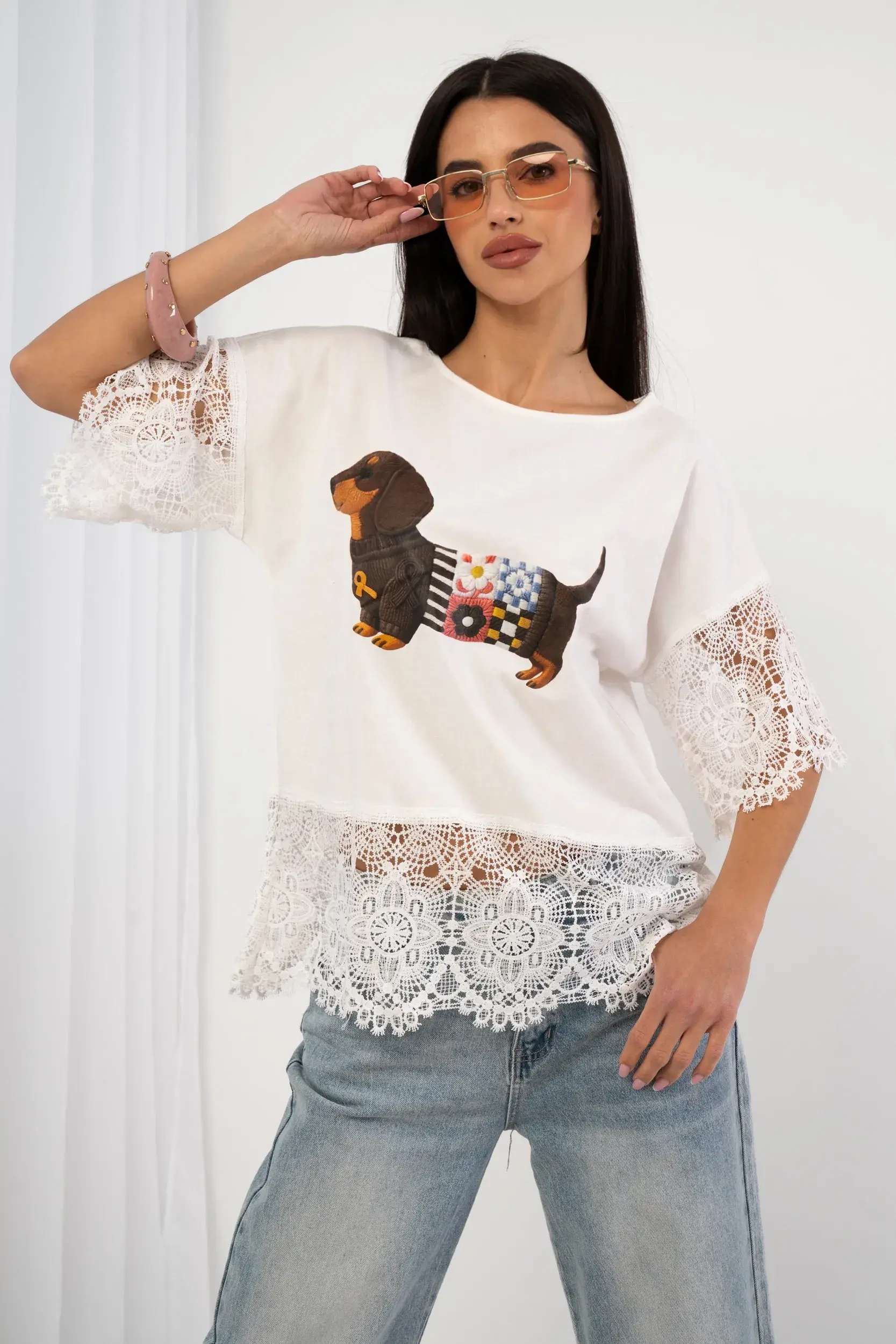 Bluzka z motywem jamnika i koronkowym wykończeniem