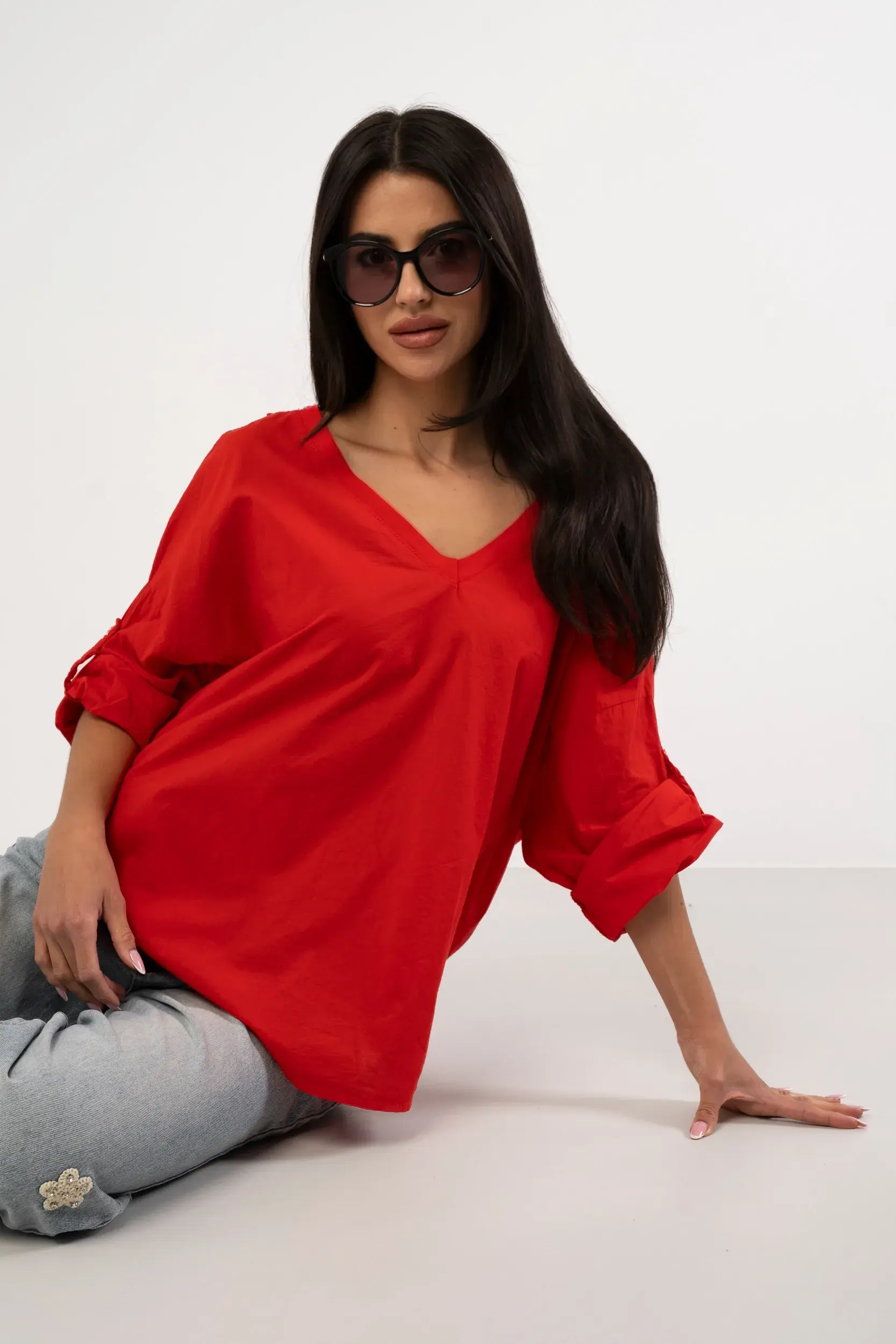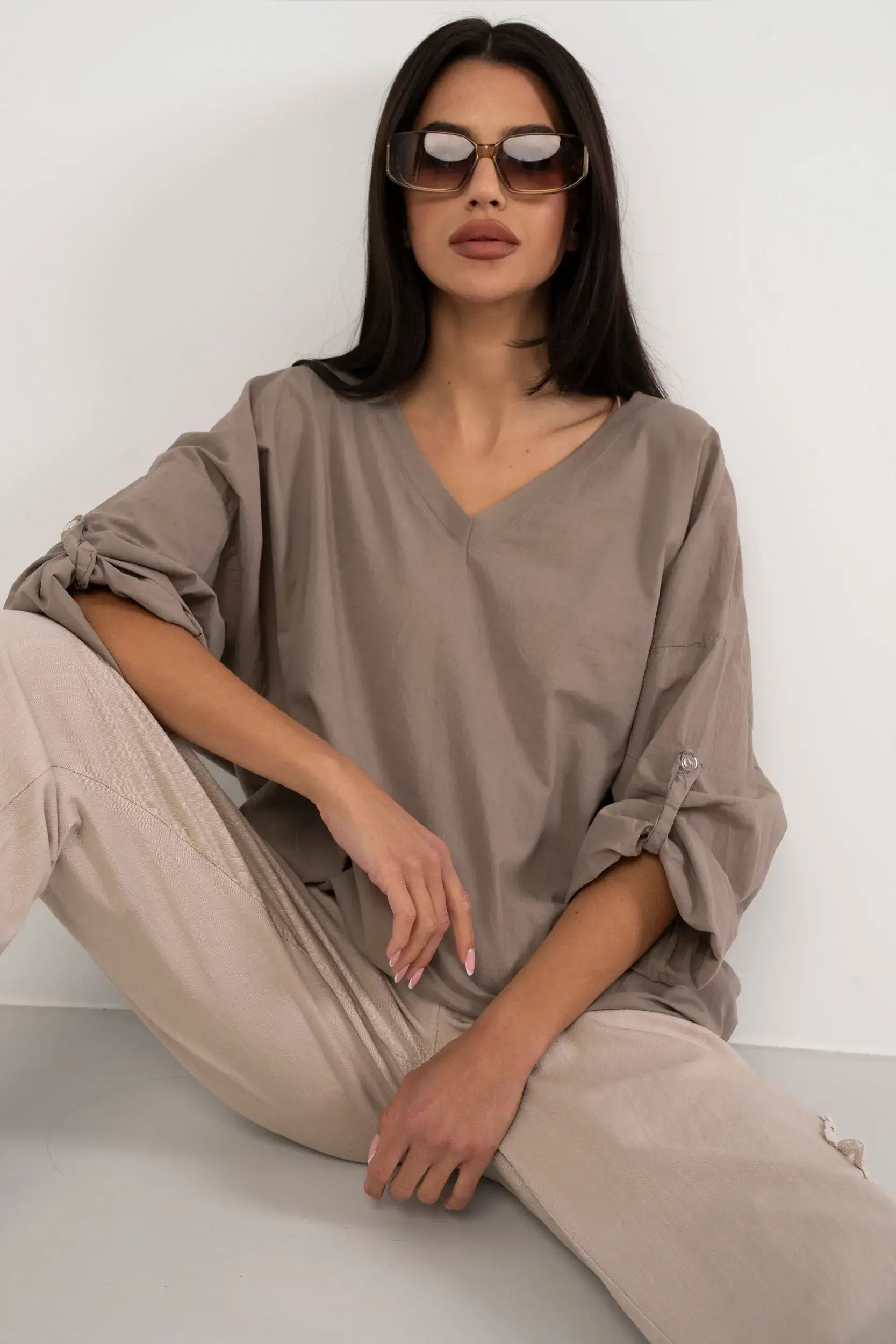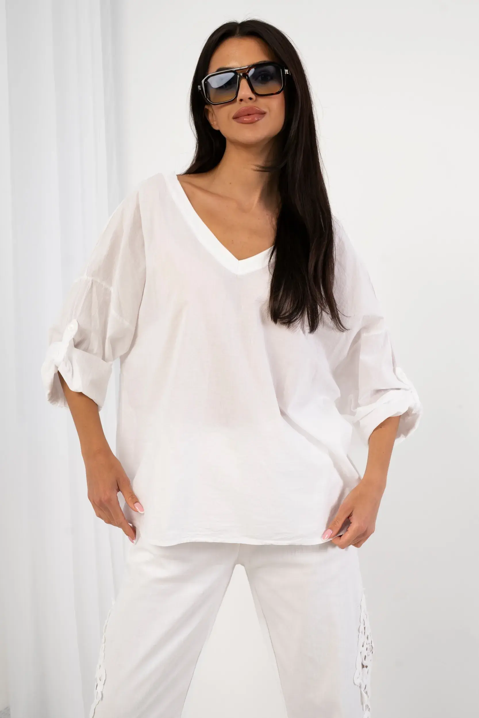 Szeroka bluzka o luźnym kroju wykonana z lekkiej, przewiewnej tkaniny o naturalnej strukturze. Model z dekoltem w serek z przodu oraz głębokim wycięciem na plecach, które zdobi kunsztowna, ażurowa aplikacja z motywem florystycznym i misterną koronką. Obniżona linia ramion oraz rękawy o długości trzy czwarte z możliwością podpięcia patką na guzik nadają całości swobodny, wakacyjny charakter. Prosty dół zapewnia komfort noszenia i doskonałe układanie się sylwetki.