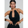Karbowana bluzka o kroju halter z efektownym, ze złotym naszyjnikiem pełniącym rolę zapięcia. Lejący dekolt typu woda subtelnie eksponuje linię szyi i ramion, dodając stylizacji zmysłowego charakteru. Wykonana z delikatnie fakturowanego materiału, który pięknie układa się na sylwetce. Model idealny na wyjątkowe okazje – doskonale komponuje się zarówno ze spodniami z wysokim stanem, jak i elegancką spódnicą.