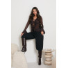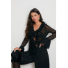 Efektowna koronkowa bluzka-narzutka o zmysłowym fasonie. Model wykonany z lekkiej, półprzezroczystej koronki, zapinany i regulowany za pomocą subtelnych wiązań na przodzie. Dekolt ozdobiony falbanami tworzy kobiecy, romantyczny efekt, a rozszerzane, warstwowe mankiety dodają całości lekkości i ruchu. Idealna na wieczorne wyjścia, kolacje i stylizacje w klimacie glamour.
