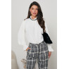 Bluzka z delikatną stójką wykończoną ozdobną taśmą i subtelną falbanką przy dekolcie. Plisowane rękawy z marszczonym wykończeniem nadają formie wyrazistego, nowoczesnego charakteru. Lekko luźny fason zapewnia wygodę i łatwo komponuje się z eleganckimi spodniami lub spódnicą, tworząc dopracowaną stylizację zarówno do pracy, jak i na specjalne okazje.
