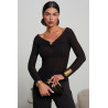 Dopasowana bluzka o wyrafinowanej, minimalistycznej linii, wyróżniająca się biżuteryjnym zdobieniem umieszczonym przy dekolcie. Delikatny twist w górnej części dodaje jej subtelnej asymetrii i elegancji, a elastyczna, lekko fakturowana tkanina miękko otula sylwetkę, podkreślając jej kształty. Długie rękawy i dopracowana konstrukcja tworzą spójny, nowoczesny efekt. To propozycja, która w prosty sposób przenosi codzienny look na wyższy poziom, dodając mu modowego charakteru i nuty wieczorowej finezji.