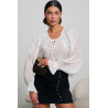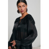 Bluzka o delikatnie lejącej strukturze, której najważniejszym akcentem jest spektakularnie zdobiony, cekinowy kołnierz. Ułożone aplikacje tworzą efekt głębi i subtelnego połysku, podkreślając linię ramion i nadając całości wieczorowy charakter. Przezroczysta tkanina miękko układa się na sylwetce, a lekkie, rozszerzane rękawy zakończone finezyjną falbaną dodają jej eterycznej lekkości. Wiązanie przy dekolcie pozwala dopasować wycięcie, tworząc zmysłowy, ale wciąż elegancki efekt. Bluzka idealna na wyjątkowe okazje i stylizacje, w których pierwsze skrzypce gra detal i wyrafinowana forma.