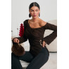 Asymetryczna bluzka ozdobiona drobnymi, koronkowymi falbankami ułożonymi warstwowo, które tworzą efekt dekoracyjnej, przestrzennej struktury. Model z odkrytym ramieniem podkreśla linię szyi i dodaje całości zmysłowego charakteru. Dekoracyjna klamra po boku dodaje całości oryginalnego akcentu i subtelnie zaznacza talię. Lekko rozkloszowany rękaw i delikatne drapowania sprawiają, że bluzka układa się miękko i efektownie przy ruchu. Idealna do eleganckich stylizacji i wieczorowych zestawów, w których główną rolę gra detal.