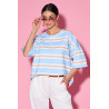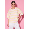 Luźna bluzka o nowoczesnym, casualowym charakterze wykonana z miękkiej, przyjemnej w dotyku dzianiny, wyróżniająca się poziomym wzorem w pasy, który nadaje jej świeżości i lekkości. Model o swobodnym kroju z obniżoną linią ramion zapewnia komfort noszenia i świetnie układa się na sylwetce, a klasyczny, okrągły dekolt subtelnie podkreśla szyję. Krótkie, szerokie rękawy dodają całości modowego luzu i sprawiają, że bluzka doskonale sprawdzi się zarówno w codziennych stylizacjach, jak i w bardziej dopracowanych zestawach.