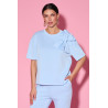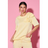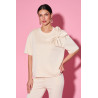 Elegancka bluzka o prostym, lekko luźnym kroju została wykonana z gładkiej, miękkiej w dotyku dzianiny, która zapewnia komfort noszenia i estetyczne układanie się na sylwetce; model wyróżnia się krótkim rękawem oraz klasycznym, okrągłym dekoltem, a jej największym atutem jest efektowna dekoracyjna kokarda umieszczona na ramieniu, nadająca całości kobiecego i nowoczesnego charakteru.