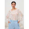 Zwiewna, półtransparentna bluzka o luźnym, romantycznym kroju została wykonana z lekkiej, delikatnie prześwitującej tkaniny, która miękko układa się na sylwetce. Model posiada szeroki, subtelnie marszczony dekolt oraz bufiaste rękawy zakończone delikatnym ściągaczem. Całość zdobią haftowane, pastelowe kwiaty, nadające jej kobiecego uroku. Lekka konstrukcja i finezyjne detale sprawiają, że bluzka idealnie łączy elegancję z nutą dziewczęcej swobody.
