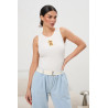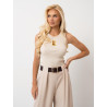 Dopasowany top bez rękawów to minimalistyczna baza do wielu stylizacji. Wykonany z elastycznej, prążkowanej dzianiny, pięknie podkreśla sylwetkę i zapewnia komfort noszenia przez cały dzień. Klasyczny, zabudowany dekolt nadaje mu uniwersalnego charakteru, a ozdobna, złota aplikacja w centralnej części dodaje całości eleganckiego, modowego akcentu. Gładkie wykończenia i staranne odszycia sprawiają, że top doskonale układa się na ciele i świetnie komponuje się zarówno ze spodniami, jak i spódnicą.