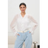 Elegancka bluzka o subtelnym, romantycznym charakterze, wykonana z lekkiej, zwiewnej tkaniny, która pięknie układa się na sylwetce. Model z delikatnie prześwitującymi rękawami zakończonymi ozdobnymi mankietami z koronkowym wykończeniem. Głęboki dekolt w kształcie litery V podkreśla szyję, a szeroki kołnierz z misterną koronką nadaje całości wyjątkowego uroku. Przód zdobi dekoracyjna aplikacja o kwiatowym motywie, która przyciąga uwagę i nadaje bluzce wyrafinowanego stylu.