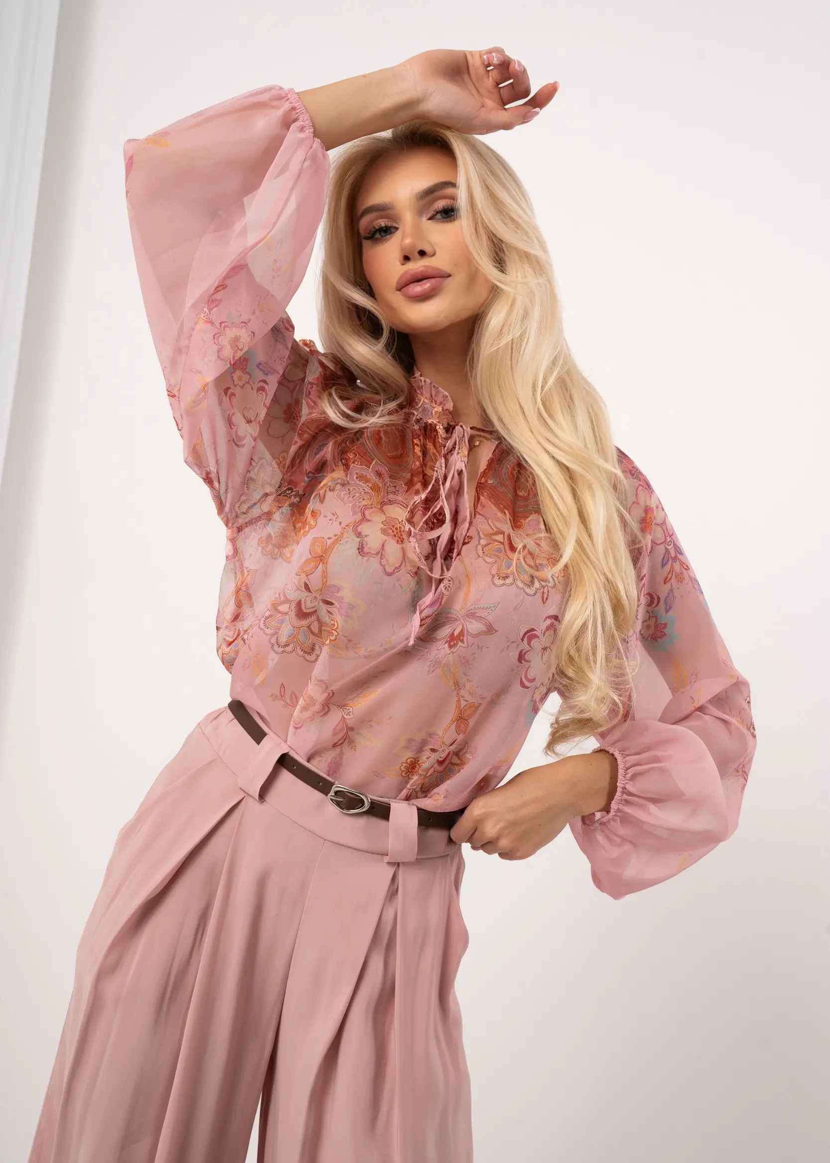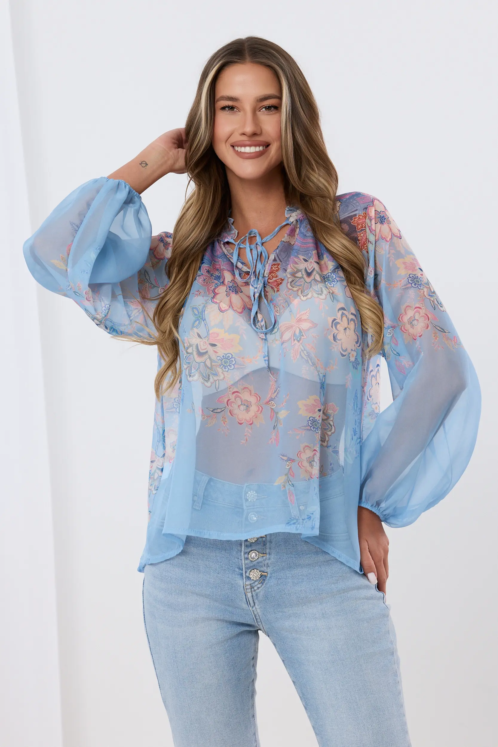 Bluzka wykonana z delikatnego, półprzezroczystego materiału, który pięknie układa się na sylwetce. Uwagę zwraca subtelny, wielokolorowy wzór paisley połączony z motywami kwiatowymi. Model posiada charakterystyczny stójkę wykończoną delikatną falbanką oraz efektowne wiązanie pod szyją na cienkie troczki. Największym atutem są obszerne, balonowe rękawy zakończone elastycznym ściągaczem, co nadaje całości modnego, romantycznego charakteru. Luźny krój zapewnia komfort noszenia i pozwala na swobodne wpuszczenie bluzki w spodnie lub spódnicę.