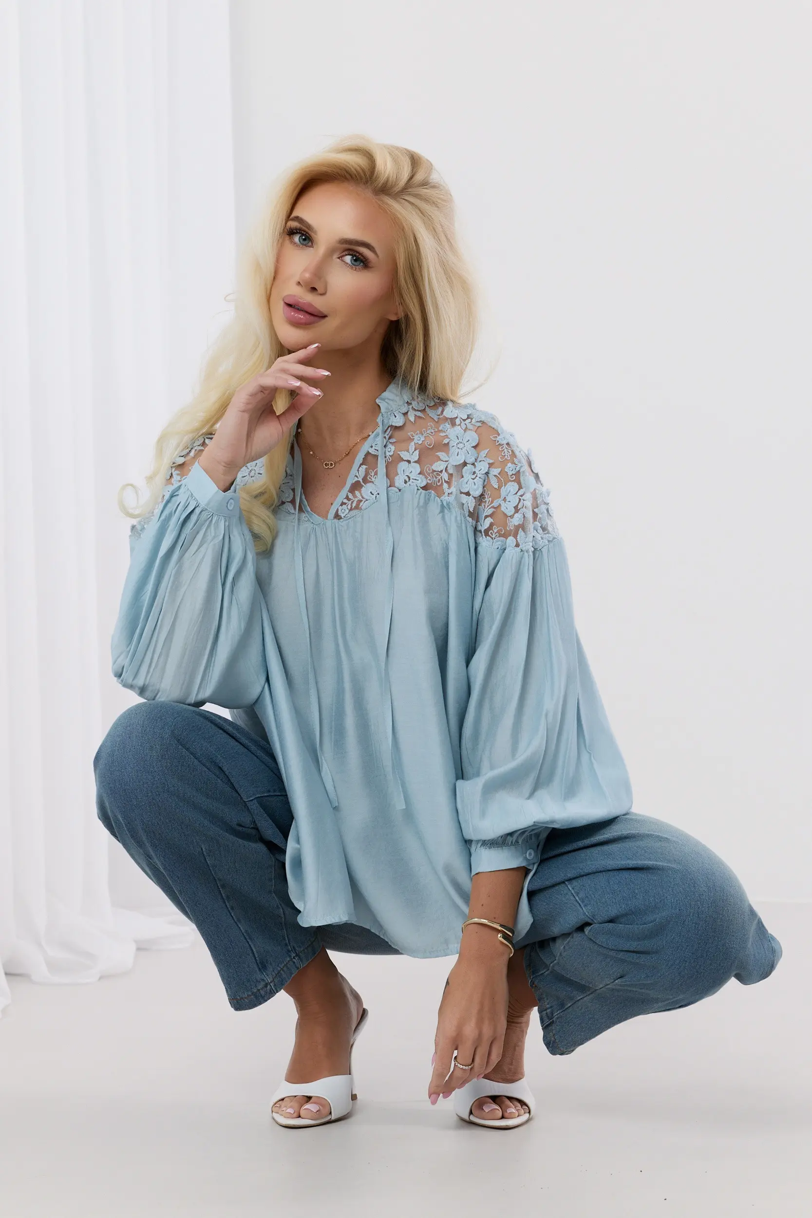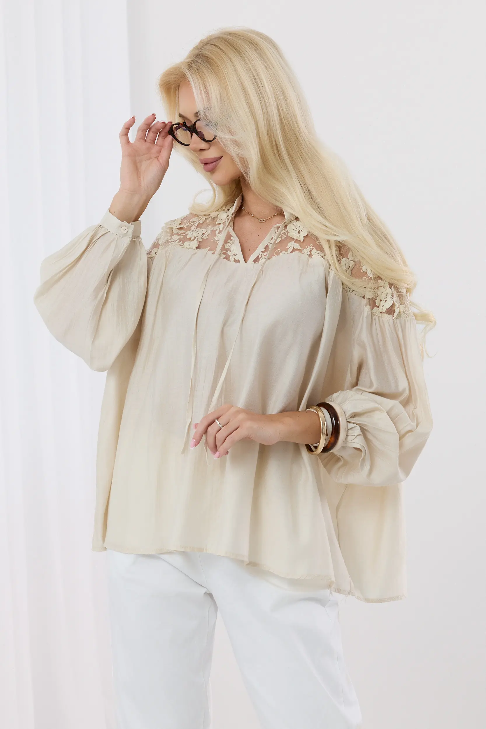 Bluzka wyróżnia się efektownymi wstawkami z ażurowej koronki o motywie florystycznym, które zdobią linię ramion i dekolt, dodając całości lekkości. Luźny fason z szerokimi, bufiastymi rękawami zakończonymi mankietami zapewnia pełen komfort noszenia i swobodę ruchów. Dekolt typu V z subtelnym wiązaniem nadaje konstrukcji finezji. Wykonana z przewiewnego, lekko strukturalnego materiału, świetnie komponuje się zarówno z klasycznymi jeansami, jak i eleganckimi spodniami, tworząc zestaw idealny na wiosenne i letnie dni.