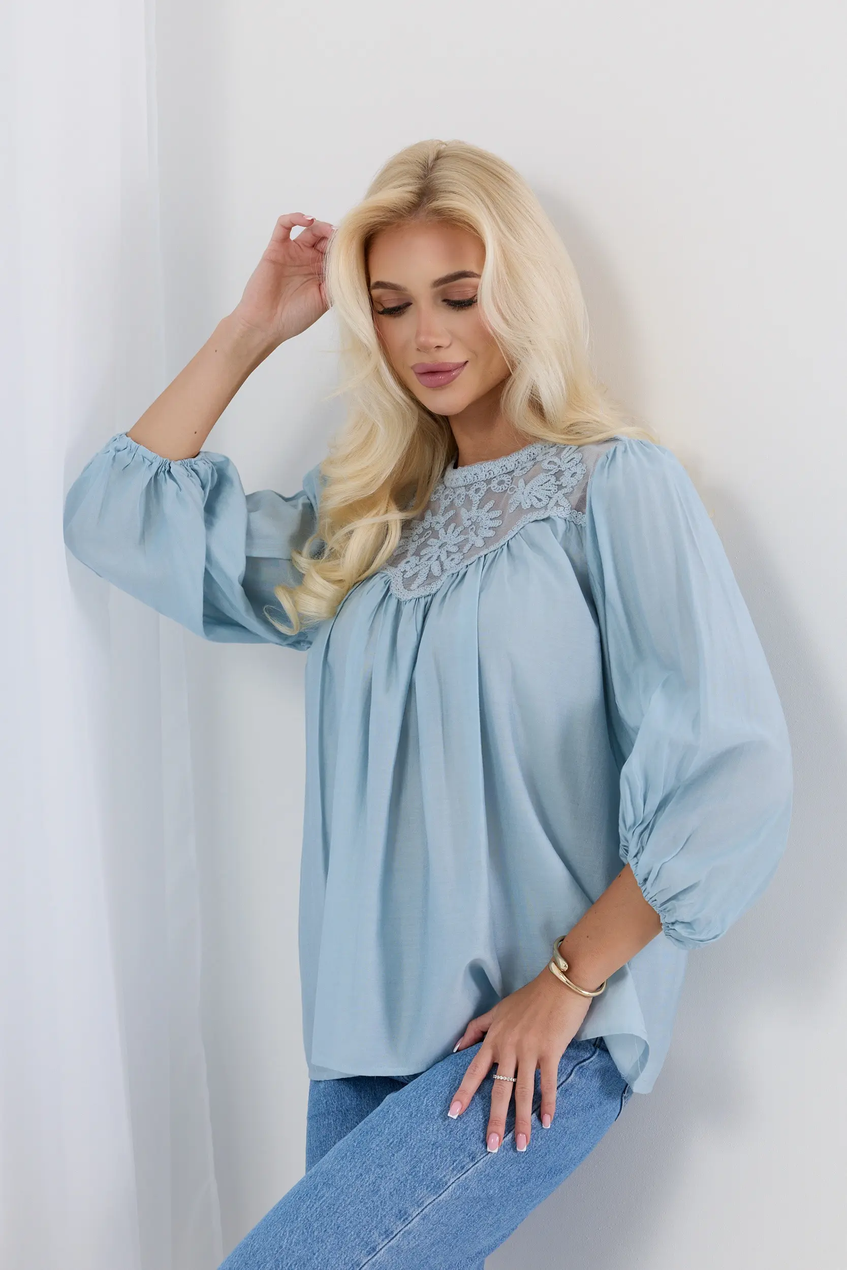 Bluzka wykonana z lekkiego materiału, charakteryzuje się swobodnym krojem typu babydoll, który zapewnia komfort. Zdobiona koronkowymi wstawkami z motywem kwiatowym przy dekolcie. Długie, bufiaste rękawy wykończone elastycznymi mankietami nadają fasonowi objętości i nowoczesnego charakteru.