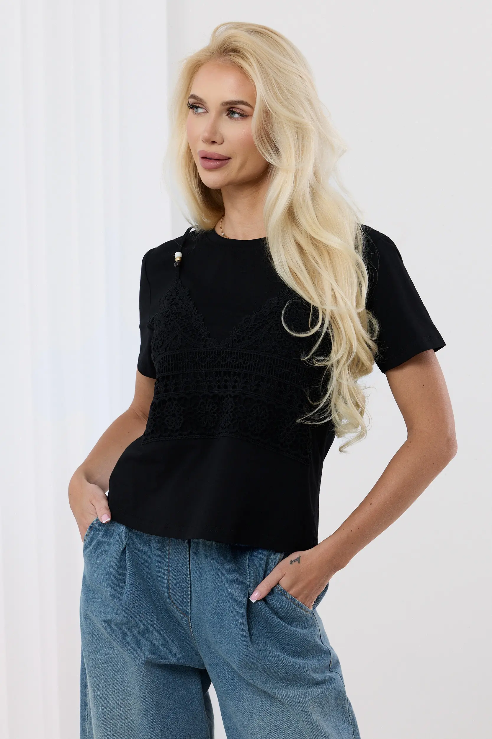 Bluzka o klasycznym fasonie t-shirta z krótkim rękawem, która wyróżnia się unikalnym, warstwowym zdobieniem na przodzie. Głównym elementem dekoracyjnym jest naszyta szeroka wstawka z kunsztownej, ażurowej koronki o kwiatowym motywie, która nadaje całości bieliźniany charakter. Model posiada okrągły dekolt wykończony subtelnym ściągaczem oraz prosty dół, co zapewnia komfort noszenia. Wykonana z gładkiej, wysokiej jakości tkaniny, doskonale komponuje się zarówno z luźnymi jeansami, jak i bardziej wizytowymi elementami garderoby.