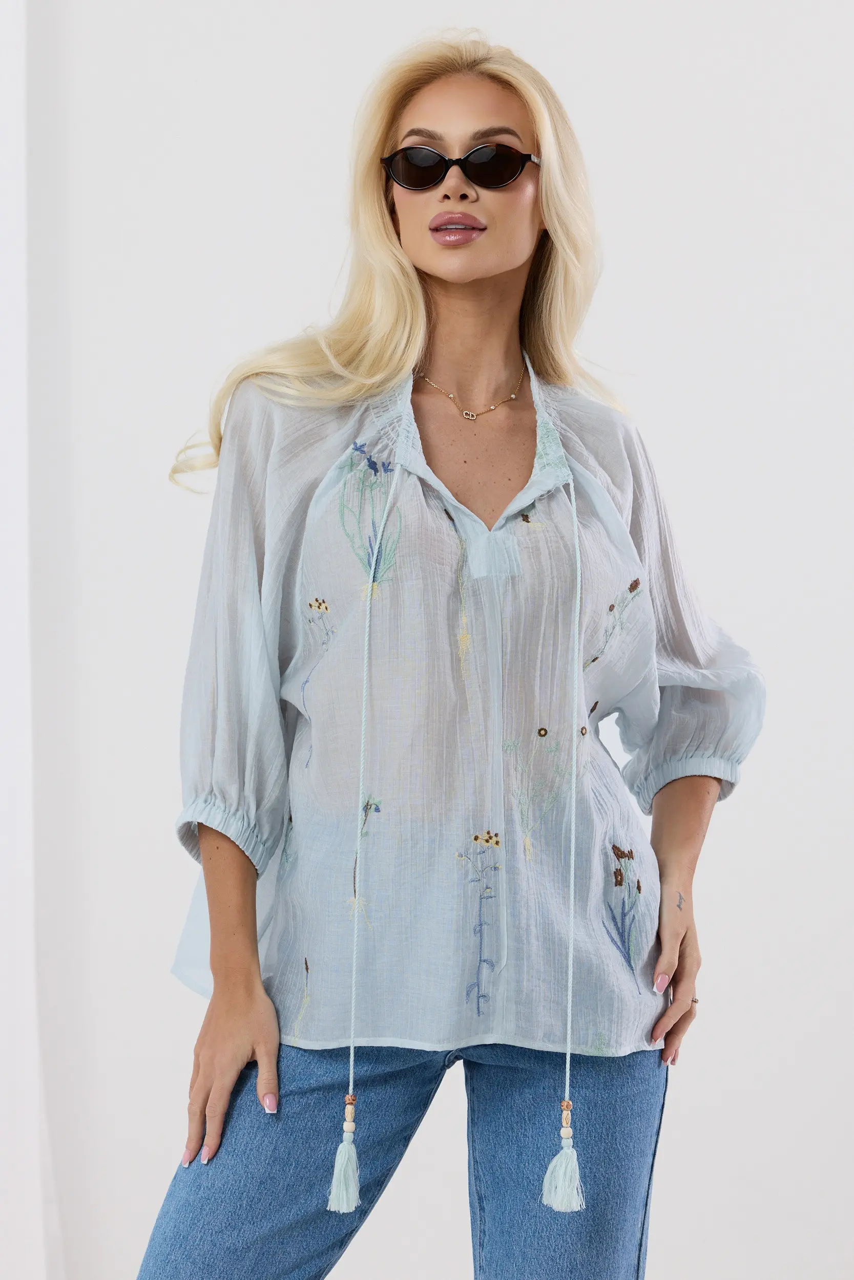 Lekka bluzka o swobodnym, zwiewnym fasonie została wykonana z delikatnie przeziernej, fakturowanej tkaniny, która zapewnia wyjątkowy komfort noszenia. Model charakteryzuje się dekoltem w kształcie litery V z subtelnym marszczeniem wokół linii ramion oraz długimi, ozdobnymi troczkami zakończonymi estetycznymi chwostami i koralikami. Powierzchnię materiału zdobią misterne, pionowo rozmieszczone hafty o motywach roślinnych. Rękawy o długości trzy czwarte mają luźny krój typu bombka i są wykończone elastycznymi gumkami, co pozwala na regulację ich formy. Bluzka idealnie wpisuje się w stylistykę boho, łącząc naturalny wdzięk z kobiecą elegancją