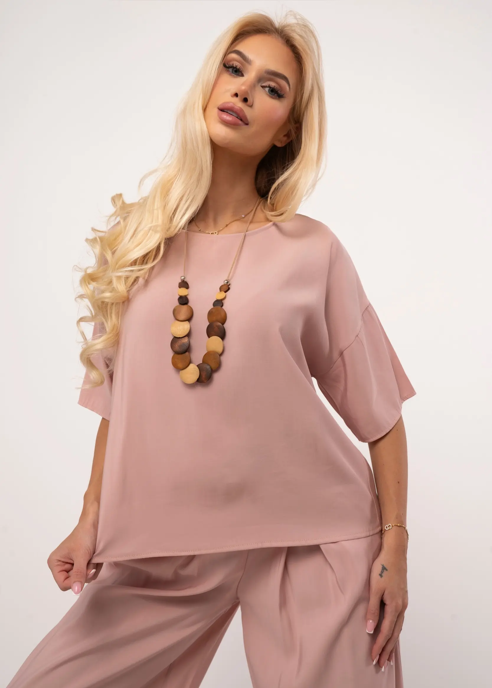 Bluzka o swobodnym kroju wykonana z lejącej tkaniny. Model z okrągłym dekoltem i krótkim rękawem typu kimono o obniżonej linii ramion, co nadaje sylwetce nowoczesny, minimalistyczny charakter. Wyjątkowy detal stanowi zapięcie na linii pleców z widocznymi, dopasowanymi kolorystycznie guzikami oraz delikatne rozcięcie u dołu.