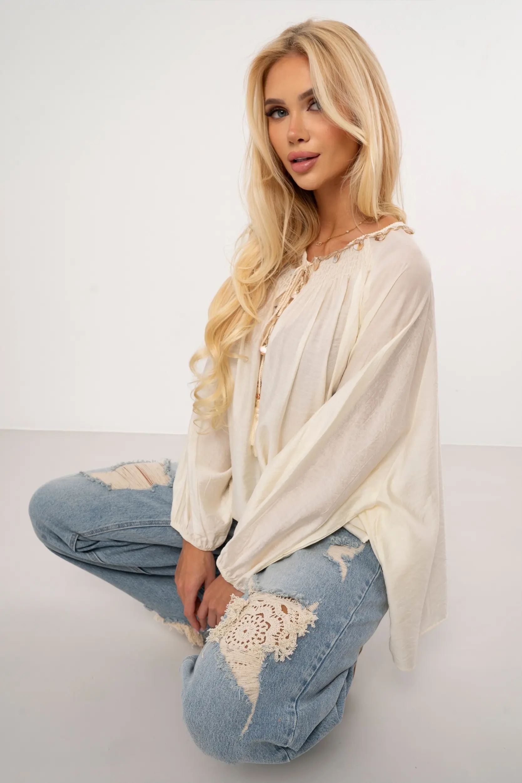 Bluzka o swobodnym, obszernym kroju wykonana z lekkiej tkaniny o subtelnym połysku. Model z okrągłym dekoltem wykończonym elastycznym marszczeniem. Ozdobne wiązanie z długimi sznurkami zwieńczonymi frędzlami oraz aplikacje z drobnych muszelek nadają całości etniczny charakter. Długi, szeroki rękaw o fasonie raglanowym z elastycznym mankietem. Szeroki dół zapewnia pełną swobodę ruchów i zwiewność. Idealna propozycja do letnich stylizacji w klimacie boho.