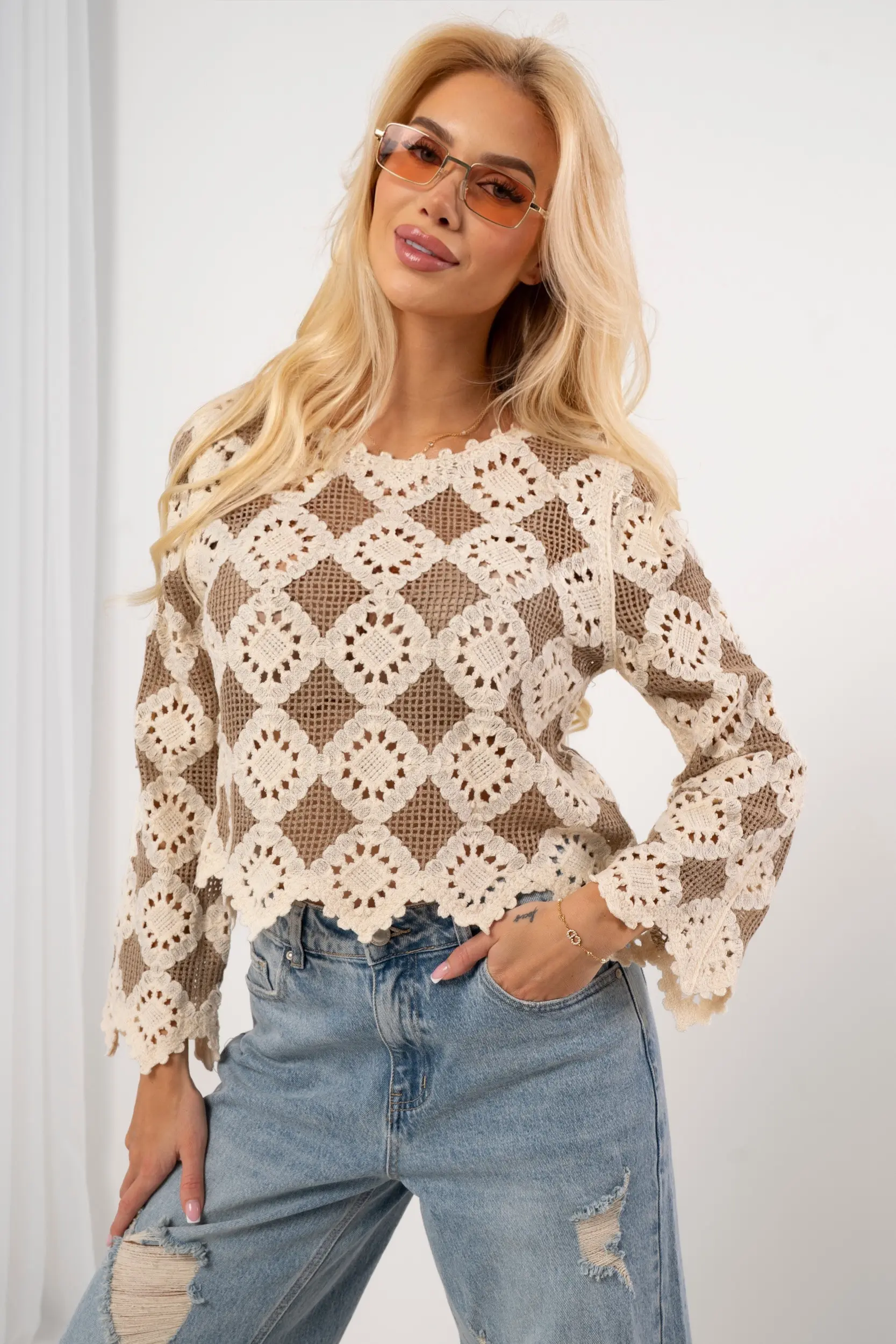 Ażurowa bluzka o swobodnym kroju wykonana z misternej dzianiny o geometrycznym splocie. Model z okrągłym dekoltem i długim rękawem wykończonym ozdobną falą. Strukturalny wzór z motywem rombów nadaje całości wyjątkowej tekstury i lekkości. Wykończenie brzegów dekoracyjnym ściegiem. Bluzka idealna do warstwowych stylizacji, łącząca nowoczesną formę z rzemieślniczym detalem. Miękka w dotyku tkanina zapewnia komfort noszenia, stanowiąc efektowny element codziennej garderoby.