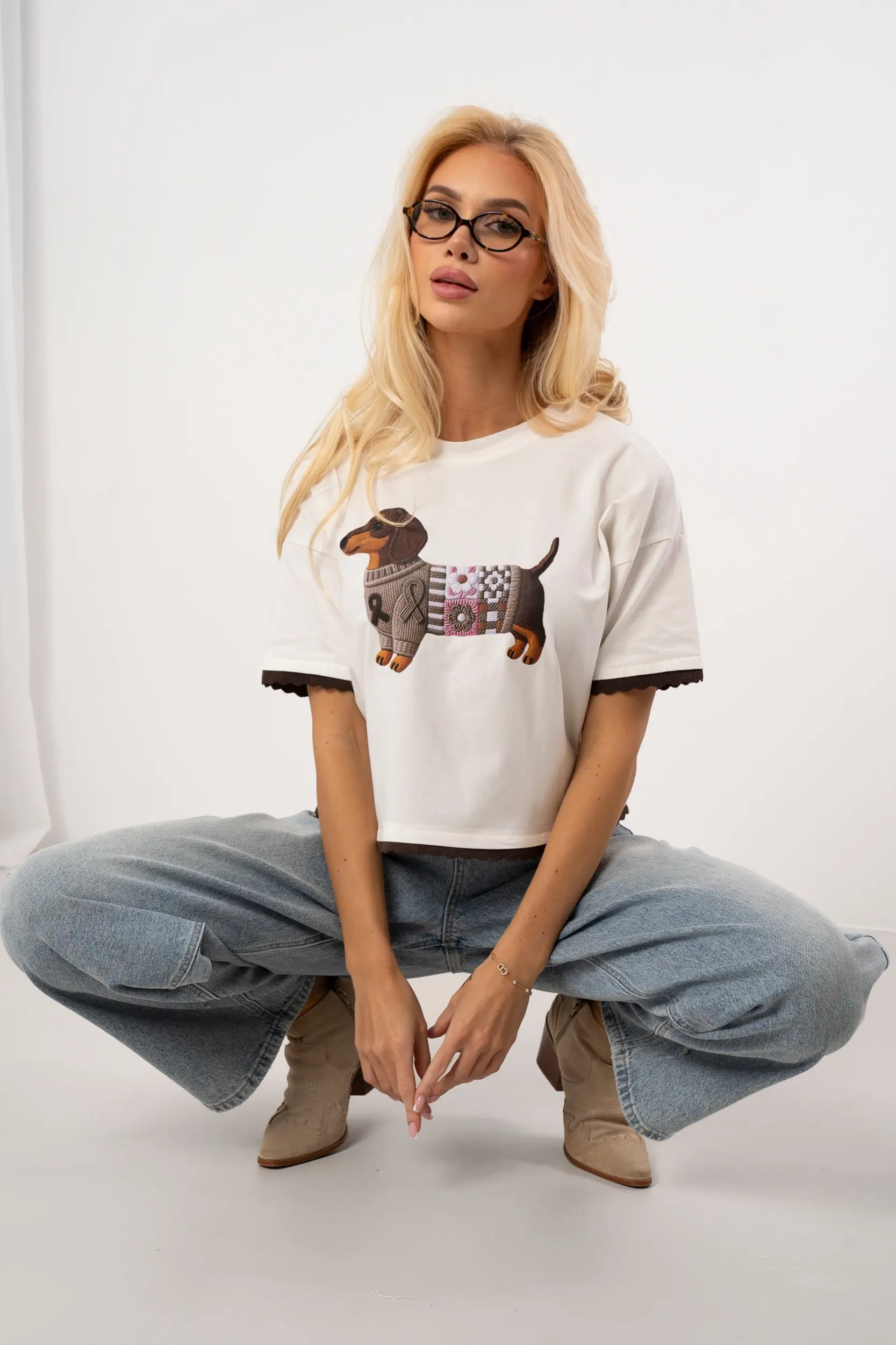 T-shirt o swobodnym kroju wykonany z miękkiej i przyjemnej w dotyku dzianiny bawełnianej. Model z okrągłym dekoltem wykończonym subtelnym ściągaczem oraz krótkim rękawem o obniżonej linii ramion, co nadaje sylwetce nowoczesny, miejski charakter. Front zdobi starannie wykonana aplikacja z motywem graficznym przedstawiającym jamnika w ozdobnym ubranku, łącząca różne tekstury i sploty. Dół koszulki oraz krawędzie rękawów wykończono kontrastową, koronkową lamówką o falistym brzegu. Idealna propozycja do zestawienia z denimem z wysokim stanem.