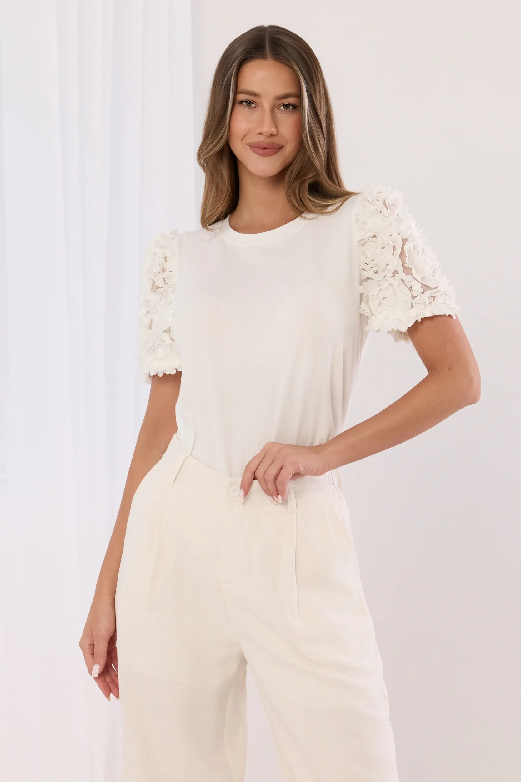 Koszulka o prostym kroju wykonana z wyjątkowo miękkiej i elastycznej dzianiny zapewniającej komfort noszenia przez cały dzień. Model z okrągłym dekoltem i krótkim rękawem, który stanowi główny punkt projektu. Rękawy zdobione kunsztownymi aplikacjami w formie misternych, trójwymiarowych kwiatów z delikatnej tkaniny, nadających całości romantyczny i nowoczesny charakter. Prosty dół z wykończeniem typu basic sprawia, że t-shirt idealnie komponuje się zarówno z eleganckimi spodniami z wysokim stanem, jak i klasycznym denimem.