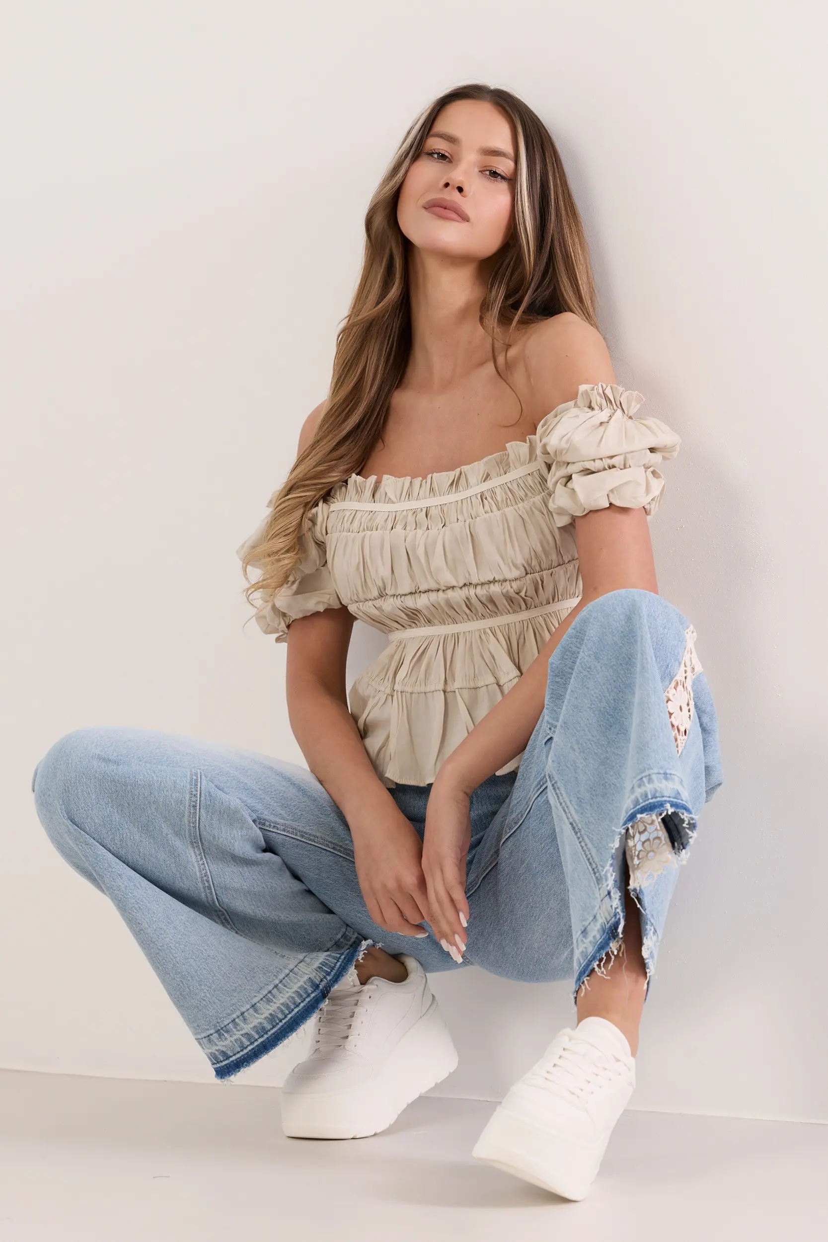 Top o dopasowanym fasonie wykonany z lekkiej, marszczonej tkaniny o efektownej strukturze. Model z kwadratowym dekoltem wykończonym subtelną falbanką. Krótkie, bufiaste rękawy z elastycznym przeszyciem podkreślają nowoczesną linię ramion. Odcięcie w pasie z elastyczną tasiemką tworzy baskinkę, subtelnie modelując sylwetkę i zapewniając wygodę noszenia. Idealna propozycja do stylizacji z wysokim stanem, łącząca kobiecy wdzięk z miejskim szykiem i dbałością o detale.