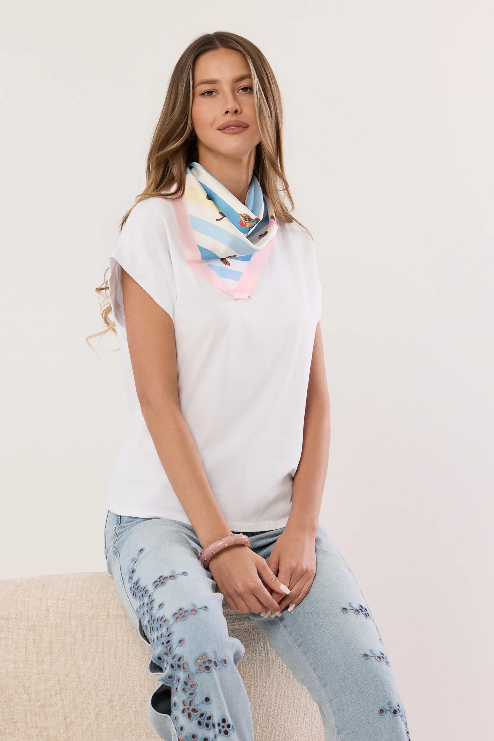 Bluzka o luźnym kroju wykonana z miękkiej i przewiewnej dzianiny o gładkim wykończeniu. Krótki rękaw o obniżonej linii ramion z subtelnym wywinięciem materiału. Unikalnym elementem bluzki jest zintegrowana apaszka z delikatnej tkaniny, ozdobiona klasycznym wzorem w pasy, efektownie wypełniająca dekolt.