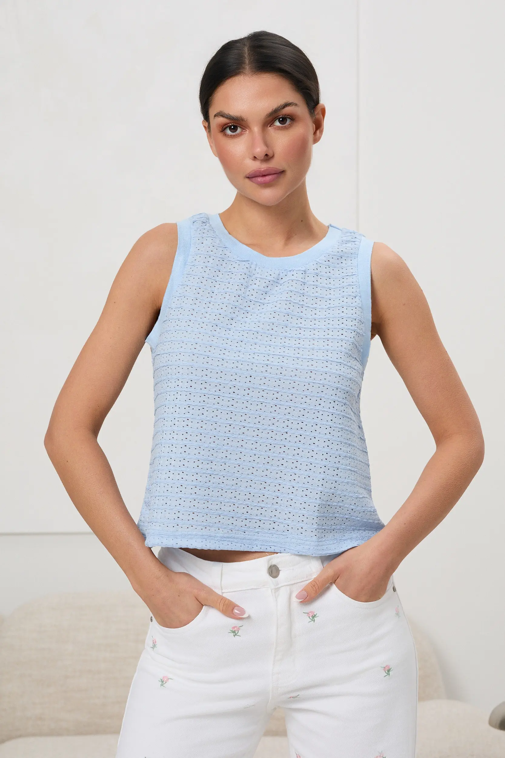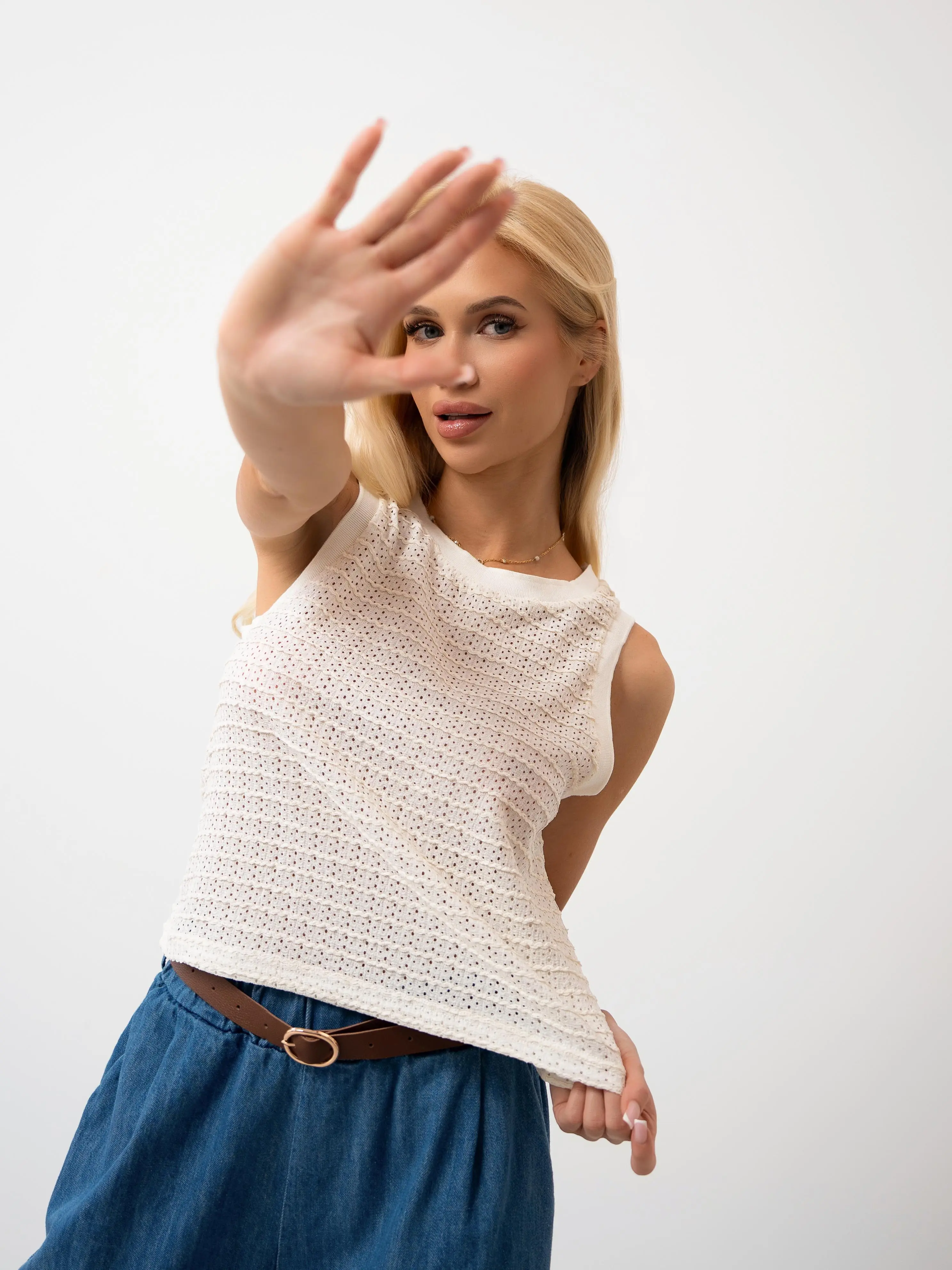 Dopasowany top bez rękawów o klasycznym, zabudowanym dekolcie subtelnie podkreśla sylwetkę i zapewnia komfort noszenia. Wykonany z ażurowej, delikatnie fakturowanej dzianiny, wyróżnia się drobnym, powtarzalnym wzorem oraz lekko elastyczną strukturą, która miękko układa się na ciele. Starannie wykończone krawędzie przy ramionach i dekolcie nadają mu estetyczny, minimalistyczny charakter, dzięki czemu świetnie sprawdzi się zarówno w codziennych, jak i bardziej eleganckich stylizacjach.