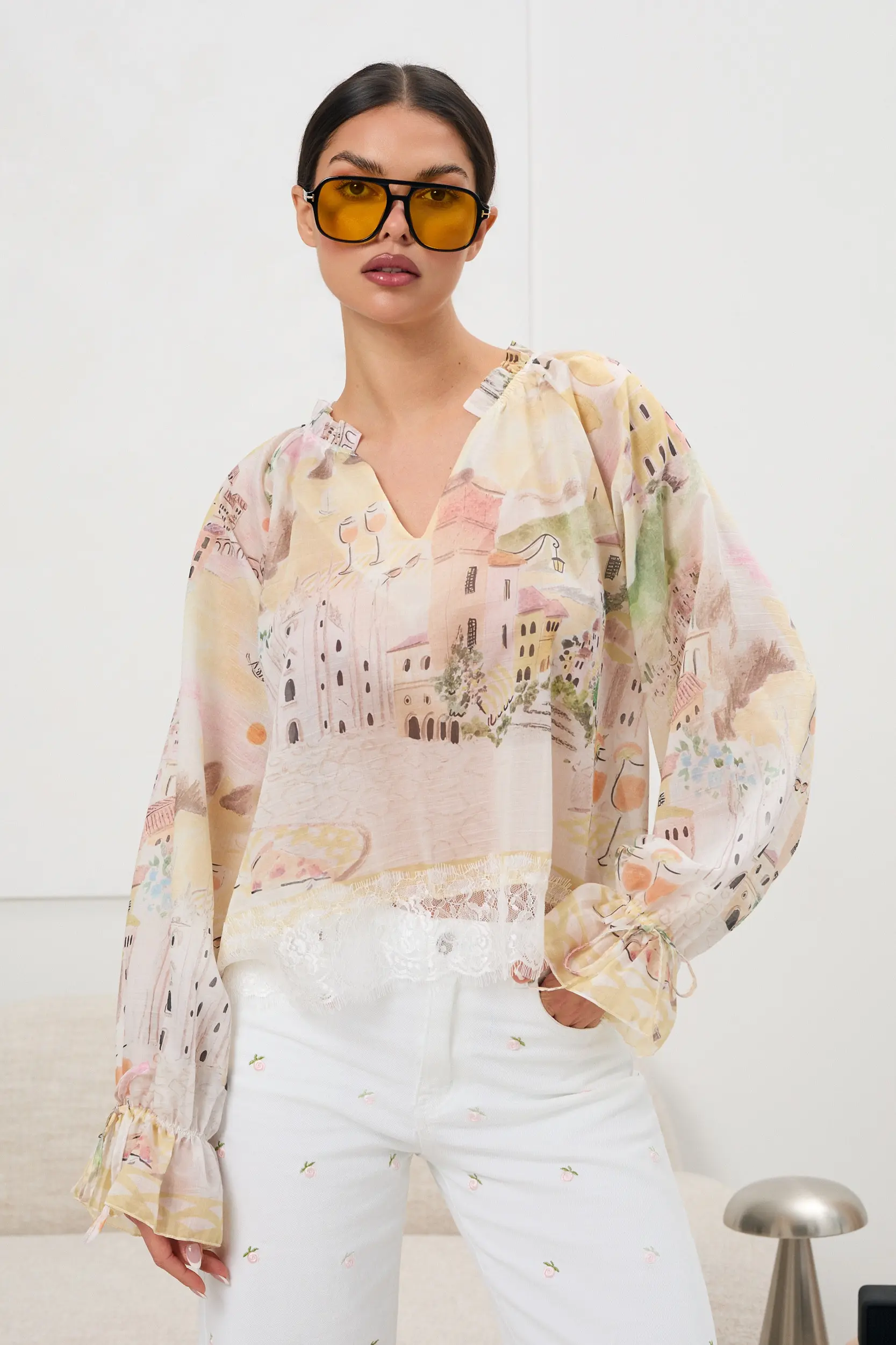 Zwiewna, lekka bluzka o luźnym, swobodnym kroju wykonana z delikatnej, półtransparentnej tkaniny. Uwagę przyciąga subtelny, pastelowy nadruk przedstawiający malownicze pejzaże i architekturę. Model z dekoltem w kształcie litery V i delikatnym marszczeniem przy szyi. Długie rękawy zakończone są efektownymi falbanami z wiązaniem, a dół bluzki wykończono koronkową lamówką, która dodaje całości romantycznego charakteru.