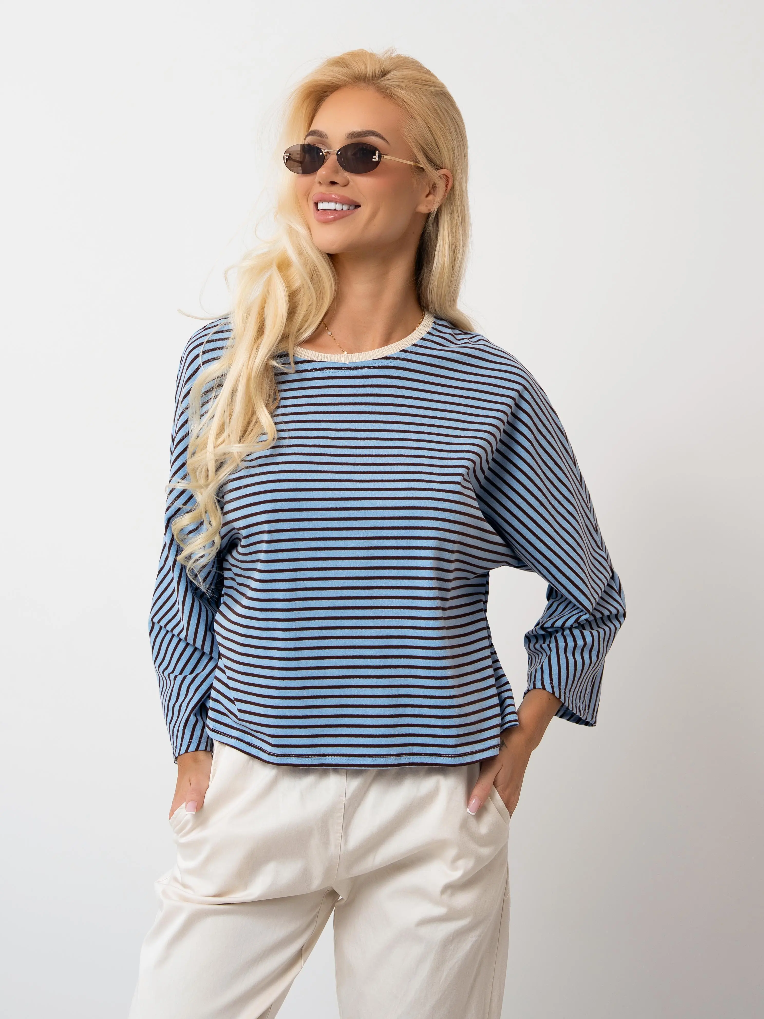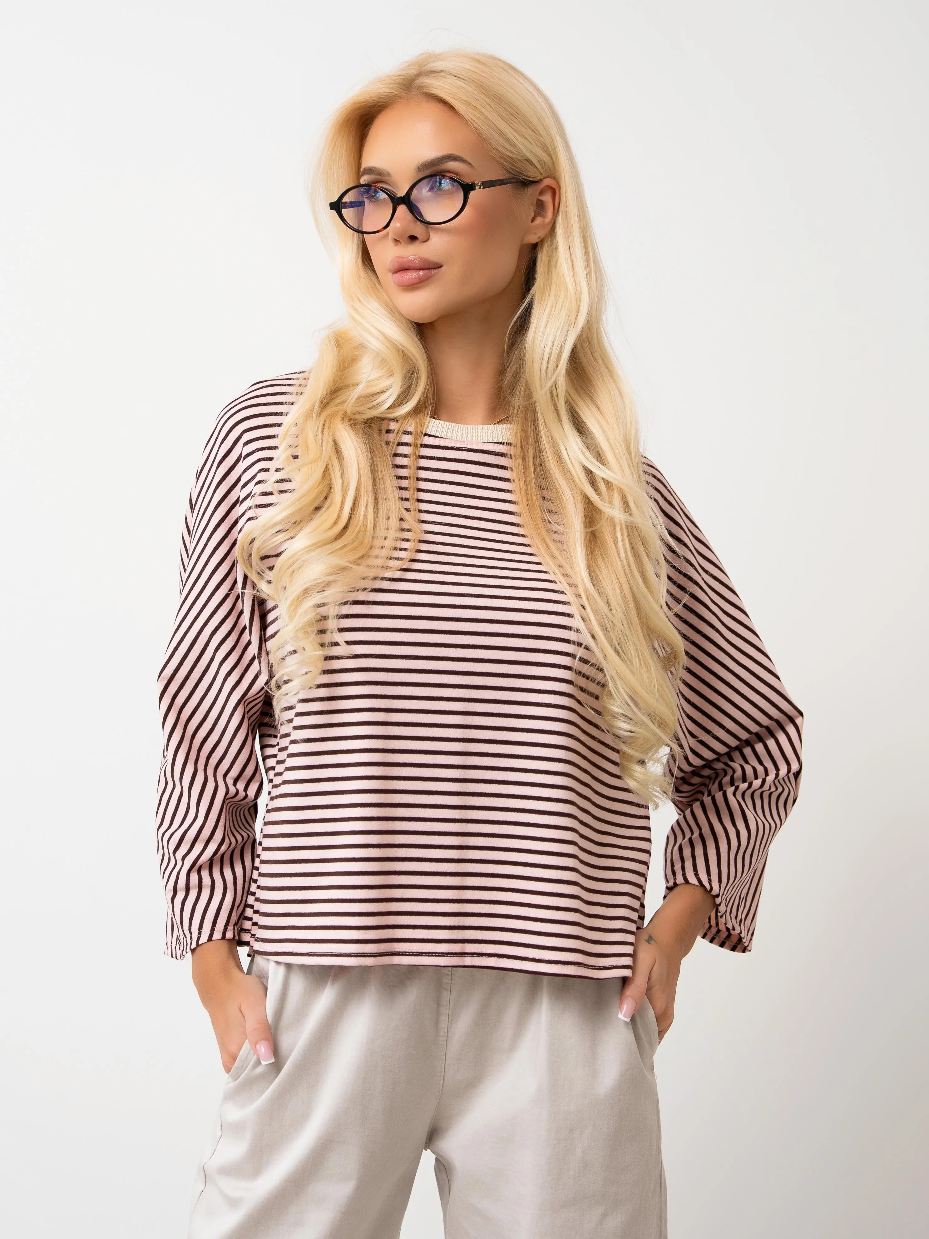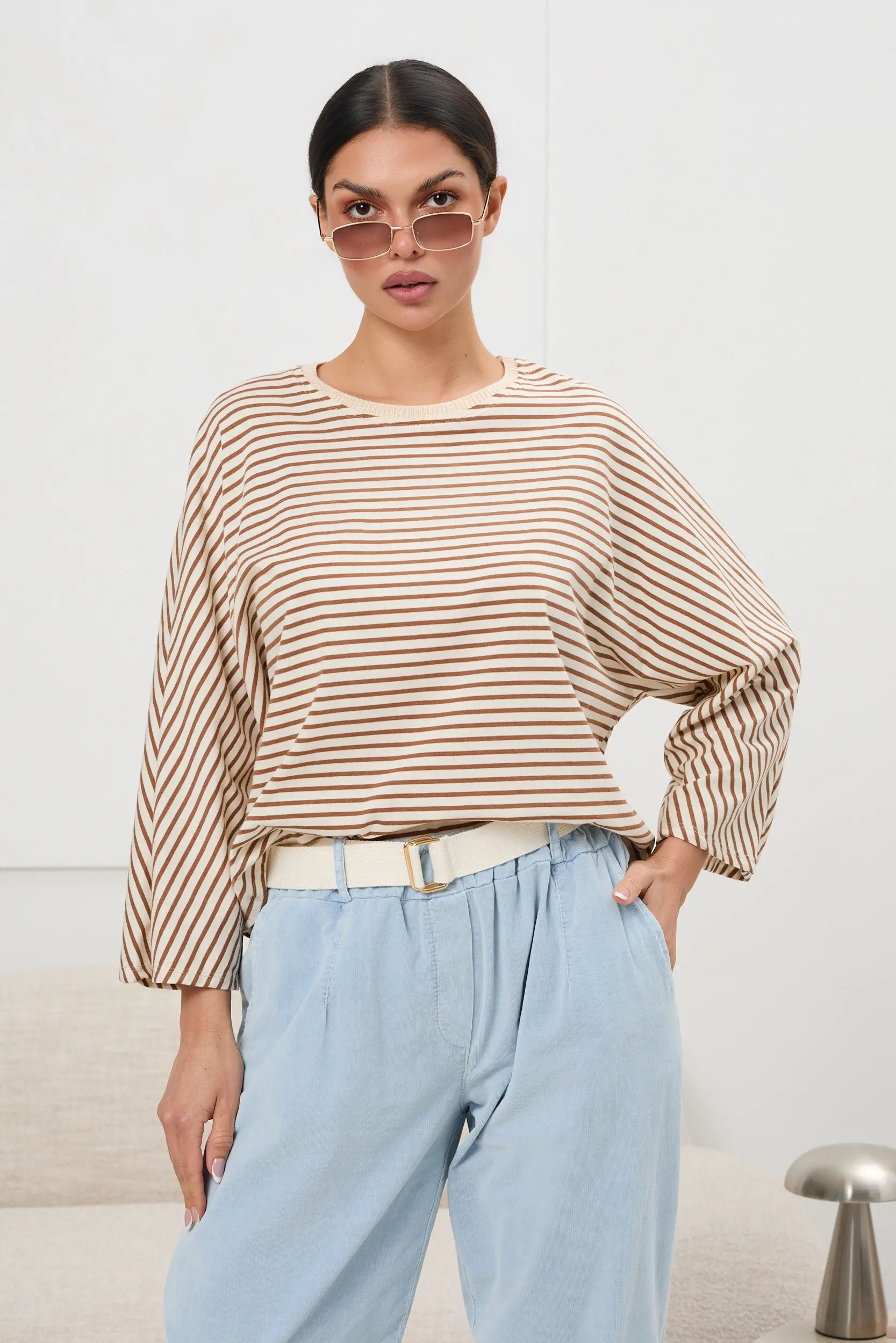 Luźna bluzka o swobodnym, oversize’owym kroju zapewnia komfort i nowoczesny wygląd. Wykonana z miękkiej, przyjemnej w dotyku dzianiny, delikatnie układa się na sylwetce, nie krępując ruchów. Model z klasycznym, okrągłym dekoltem oraz szerokimi, lekko wydłużonymi rękawami nadaje stylizacji nonszalanckiego charakteru. Subtelny wzór w paski podkreśla minimalistyczny design, a prosta forma sprawia, że bluzka doskonale sprawdzi się zarówno w codziennych, jak i bardziej casualowych zestawieniach.