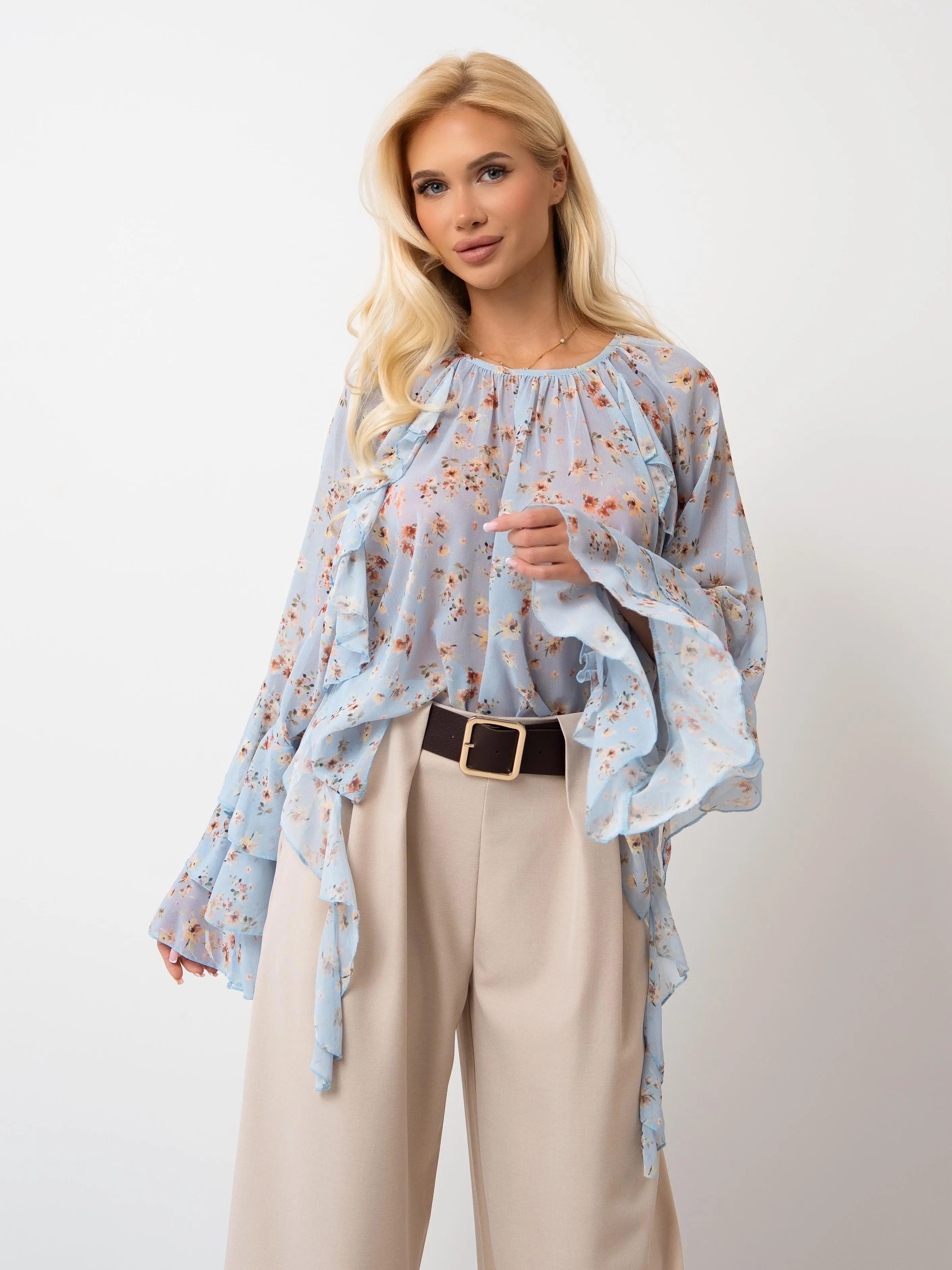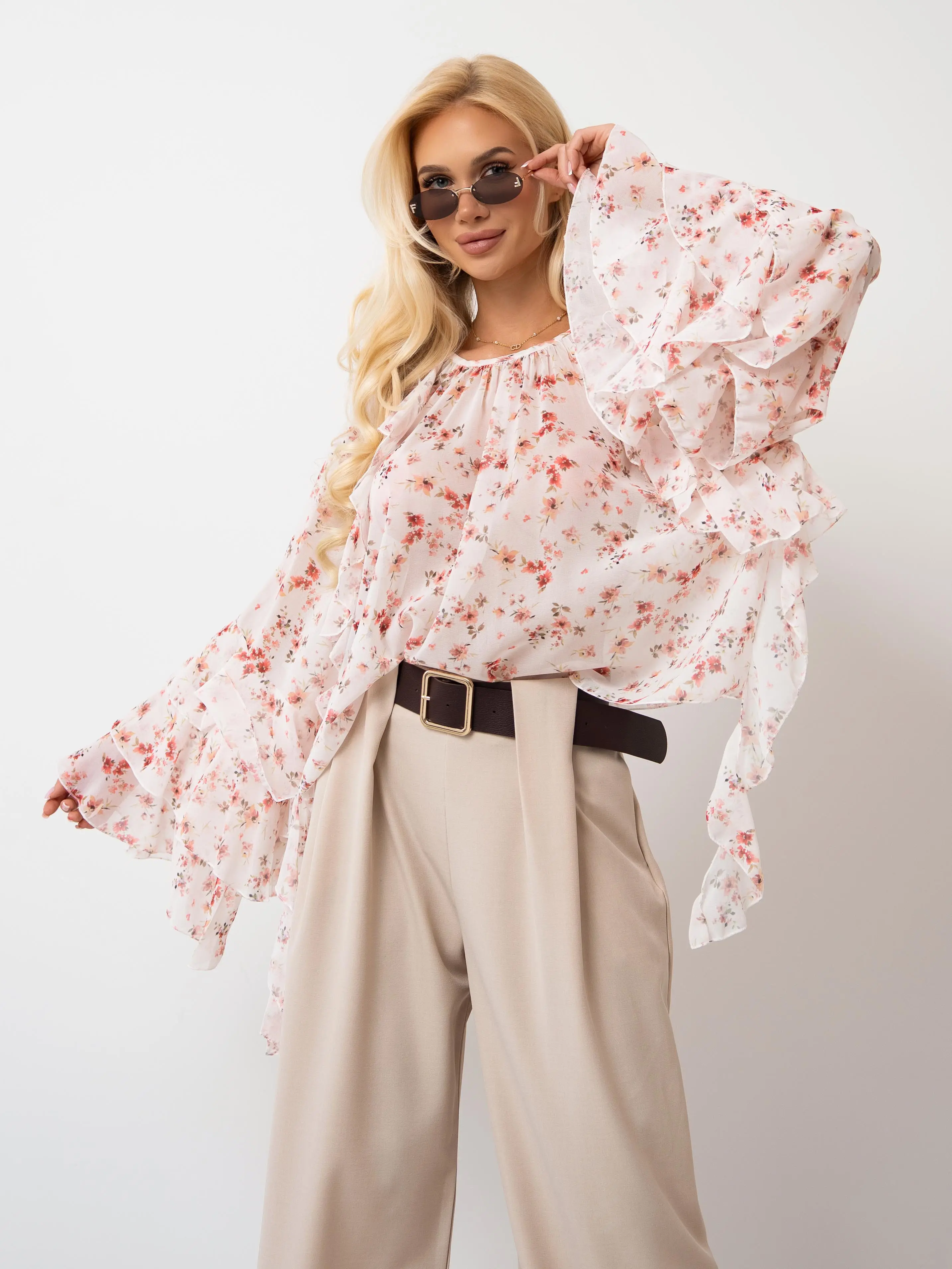 Efektowna bluzka przyciąga wzrok kwiatowym wzorem, umieszczonym na jasnym tle. Wykonana z lekkiego, zwiewnego materiału, charakteryzuje się niezwykle ozdobnymi, szerokimi rękawami wykończonymi gęstymi falbanami, które nadają sylwetce lekkości i objętości w stylu boho. Swobodny fason z delikatnym marszczeniem przy dekolcie zapewnia komfort noszenia, a subtelne troczki przy mankietach stanowią uroczy detal. To idealna propozycja na wiosenne wyjścia, łącząca w sobie elegancję z nutą finezji i nowoczesnego designu.
