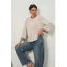 Oversizowa bluza z wiskozy o warstwowym wykończeniu, które sprawia wrażenie noszenia dwóch bluz jednocześnie. Konstrukcja modelu opiera się na swobodnej linii oraz luźnych wykończeniach przy rękawach i dekolcie, podkreślających lekkość i nowoczesny charakter całości. Skrócona długość rękawów w połączeniu z szeroką sylwetką nadaje bluzie współczesny, relaxed wygląd. Okrągły dekolt naturalnie wpisuje się w warstwową konstrukcję, zachowując spójność detali. Wiskozowa dzianina sprawia, że model doskonale sprawdza się w wiosennych stylizacjach — noszony samodzielnie lub jako element swobodnych, codziennych zestawów.