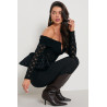 Eleganckie koronkowe body z odkrytymi ramionami i głębokim dekoltem typu hiszpanka. Wykonane z elastycznej koronki o subtelnym, geometrycznym wzorze, pięknie podkreśla sylwetkę i dodaje kobiecego charakteru. Idealne do stylizacji wieczorowych lub jako szykowny akcent w codziennym looku. Świetnie komponuje się z szerokimi spodniami, marynarką lub spódnicą o podwyższonej talii. Idealny wybór, gdy chcesz wyglądać zmysłowo, ale z klasą.