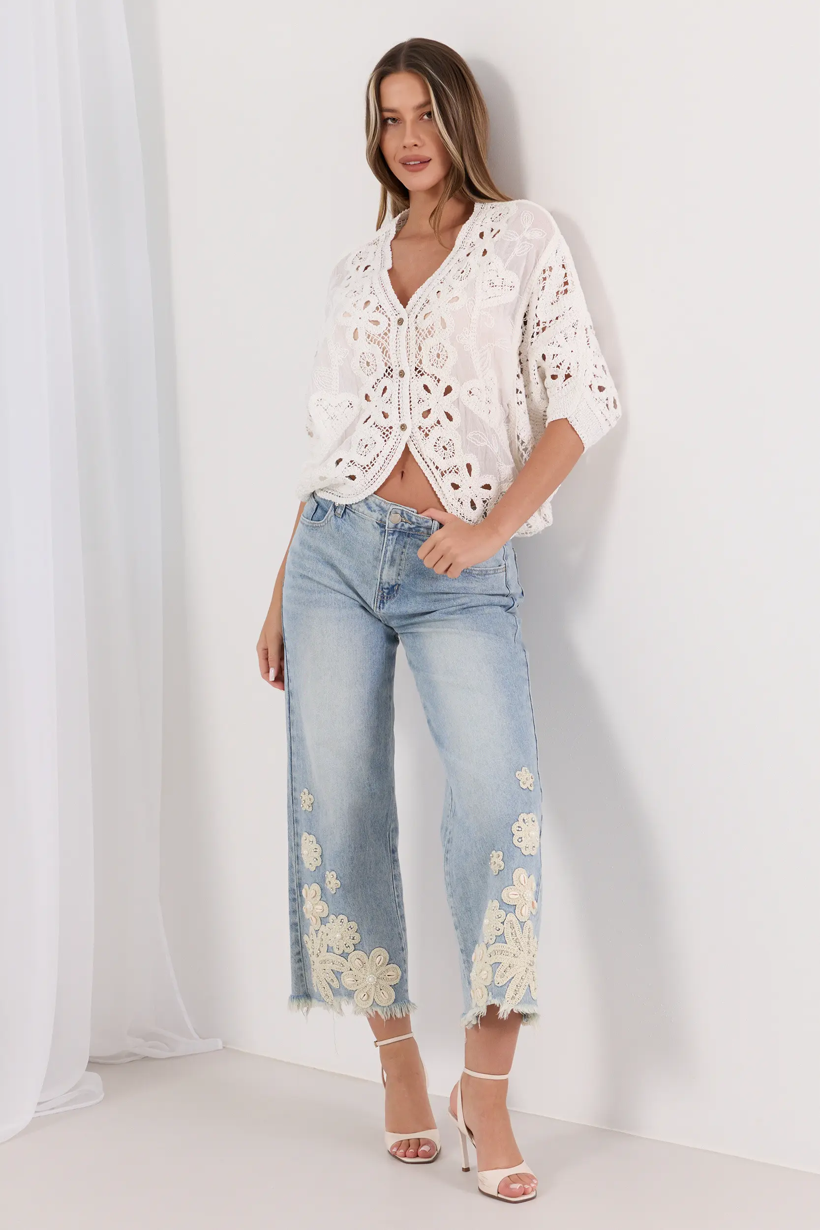 Jeansy o prostym kroju z wysokim stanem, wykonane z wysokiej jakości denimu. Model wyróżnia się unikalnymi aplikacjami w kształcie kwiatów, które zdobią dolną część nogawek. Zdobienia wykonano z kremowej plecionki, wzbogacając je o detale z koralików, cyrkonii oraz naturalnych muszelek, co nadaje całości luksusowy charakter boho. Nogawki o długości 7/8 zakończone surowym, postrzępionym brzegiem. Klasyczne zapięcie na suwak i metalowy guzik. Idealne do letnich stylizacji z ażurową koszulą lub prostym topem.