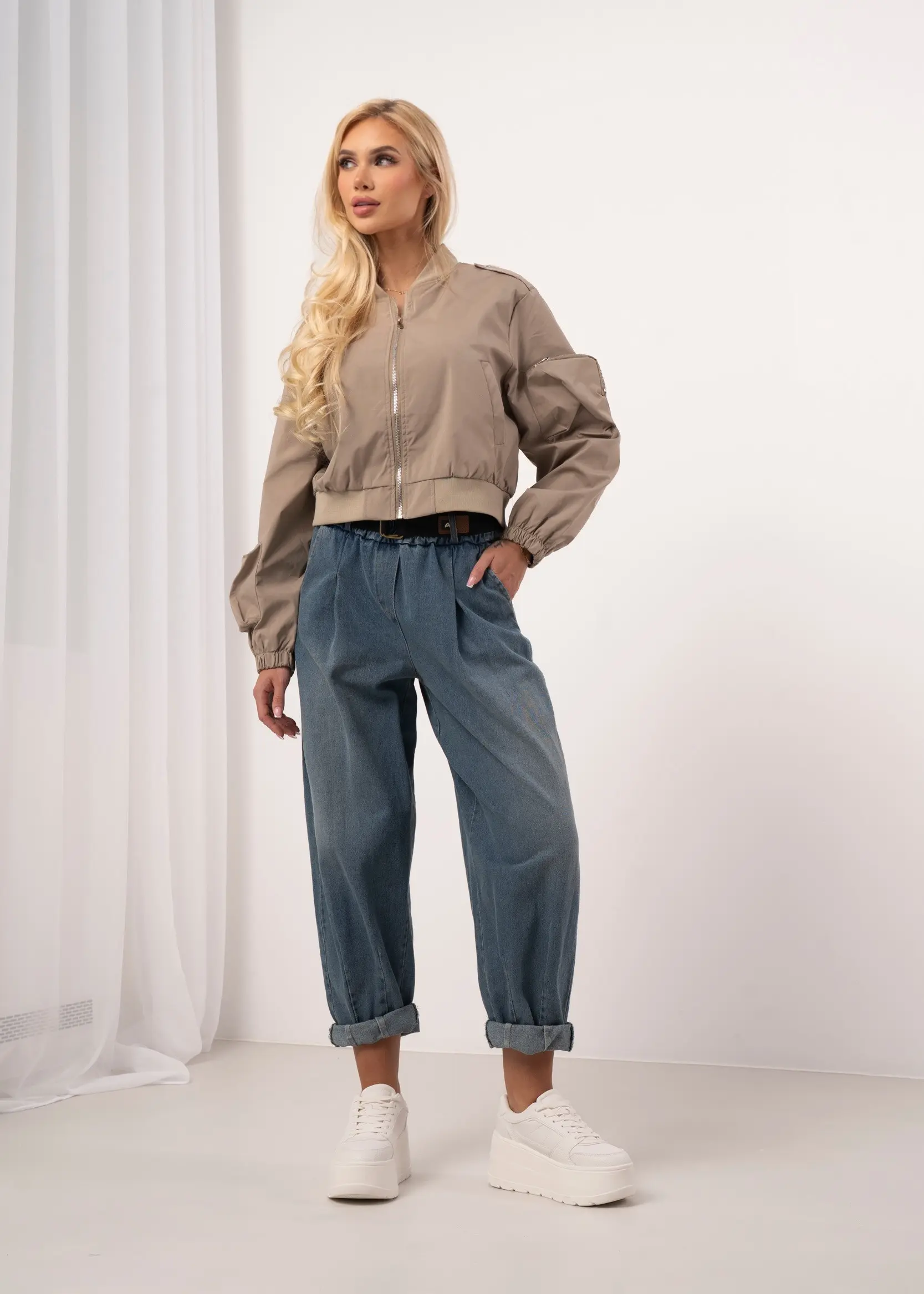 Spodnie o szerokim kroju wykonane z wysokiej jakości denimu. Model z wysokim stanem podkreślonym elastycznym wykończeniem typu paperbag, które zapewnia idealne dopasowanie i komfort noszenia. Z przodu ozdobne zakładki nadające nogawkom objętości oraz klasyczne kieszenie w szwach bocznych. Szerokie, lekko zwężane ku dołowi nogawki z możliwością wywinięcia. Zapięcie na kryty suwak oraz guzik, uzupełnione szlufkami z paskiem. Idealna baza do casualowych stylizacji z charakterem.