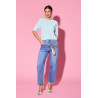 Jeansy o prostych nogawkach i wysokim stanie, który pięknie podkreśla talię. Wykonane z ciemnego denimu o średnim spraniu, prezentują się lekko i ponadczasowo, dzięki czemu łatwo dopasować je do wielu stylizacji. Prosty krój nogawek delikatnie wydłuża sylwetkę, a długość do kostki nadaje im nowoczesnego charakteru. Spodnie posiadają klasyczne zapięcie na guzik i zamek, szlufki na pasek oraz funkcjonalne kieszenie, a całość uzupełnia ozdobny detal w postaci łańcuszka z apaszką, który dodaje im modowego akcentu i wyróżnia je na tle standardowych jeansów.