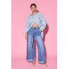 Szerokie jeansowe spodnie o modnym kroju wide leg, wykonane z klasycznego denimu, wyróżniają się wysokim stanem, który podkreśla talię i zapewnia wygodne dopasowanie, oraz prostymi, luźnymi nogawkami zakończonymi efektownym podwinięciem dodającym całości nonszalanckiego charakteru; model posiada praktyczne kieszenie, solidne przeszycia oraz dekoracyjny, pleciony pasek z tego samego materiału, który nadaje spodniom oryginalności.
