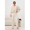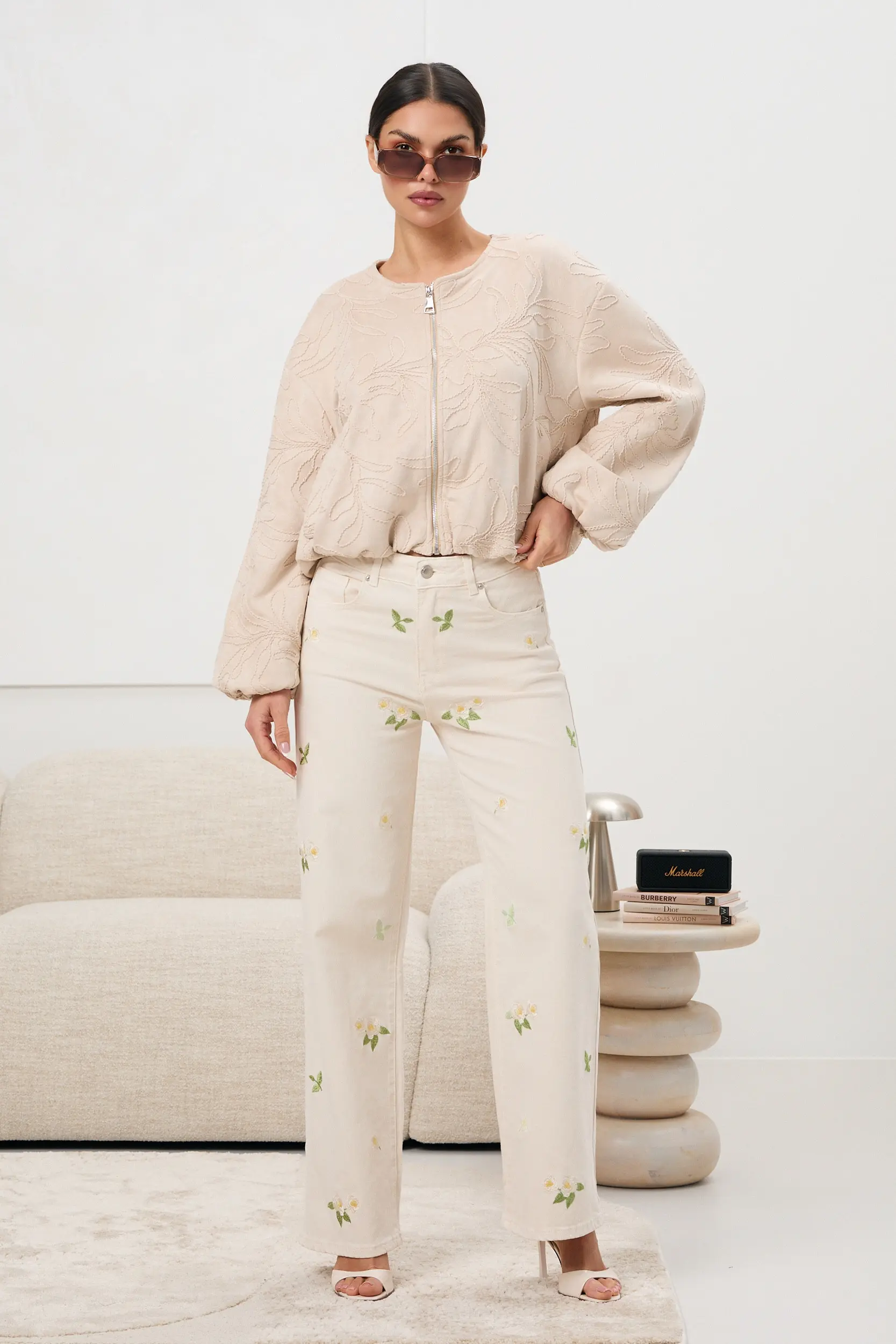 Spodnie jeansowe o prostym, lekko rozszerzanym kroju z wysokim stanem, który subtelnie podkreśla talię i zapewnia komfort noszenia. Ozdobione delikatnym, rozproszonym haftem w drobne kwiaty w odcieniach zieleni i żółci, nadają stylizacji świeżości i lekkości. Model posiada klasyczne zapięcie na guzik i zamek oraz praktyczne kieszenie. Długa, swobodnie opadająca nogawka optycznie wydłuża sylwetkę, tworząc elegancki, a zarazem nowoczesny efekt.