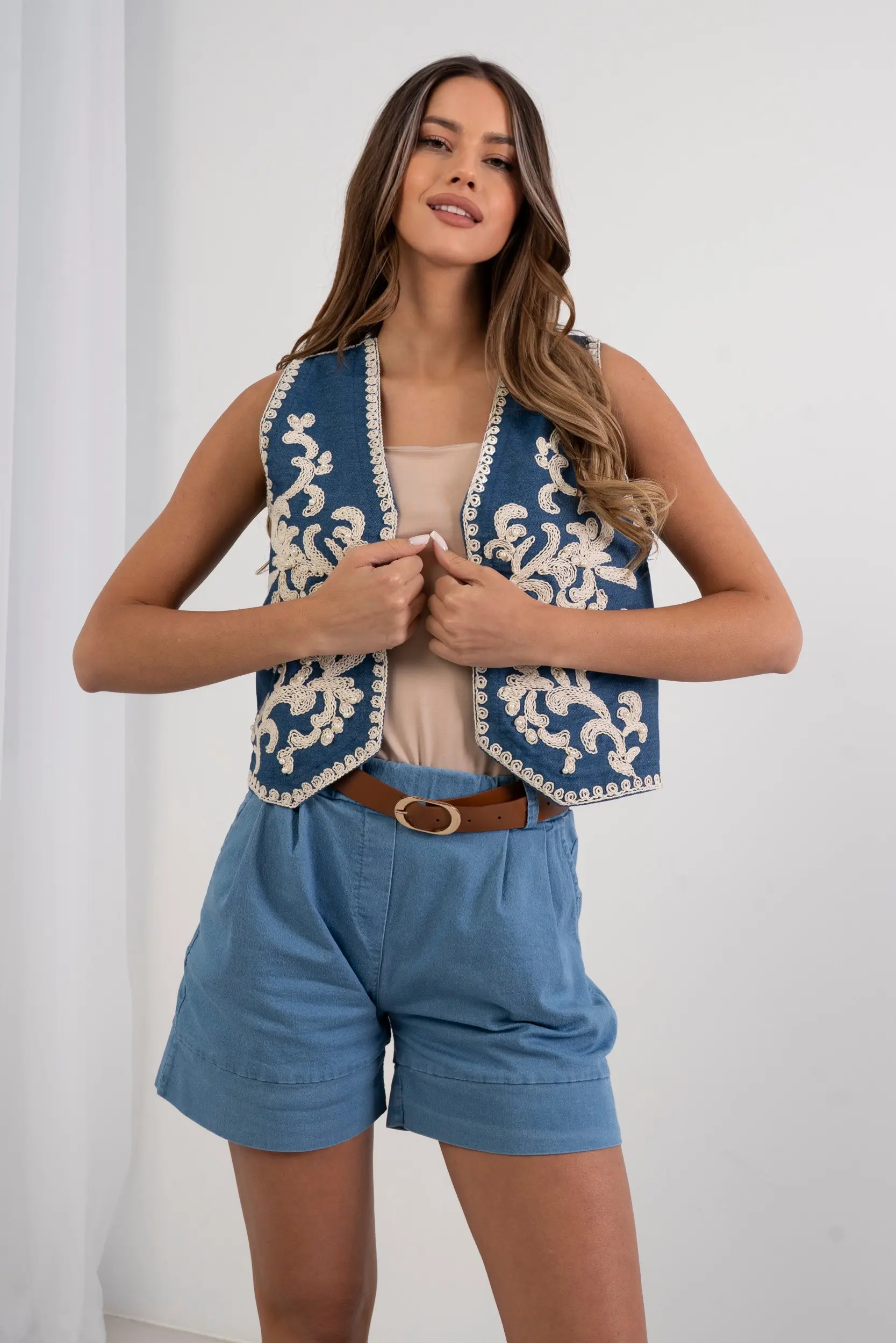 Krótka kamizelka o dopasowanym kroju, wykonana z wysokiej jakości tkaniny. Model bez rękawów. Całość zdobią kunsztowne, wypukłe hafty o motywie florystycznym oraz delikatne, połyskujące aplikacje z pereł, nadające luksusowy charakter w stylu boho-chic. Wykończenie brzegów dekoracyjną lamówką podkreśla dbałość o detale. Idealna do zestawienia z klasycznym topem i jeansami z wysokim stanem dla przełamania casualowego looku.