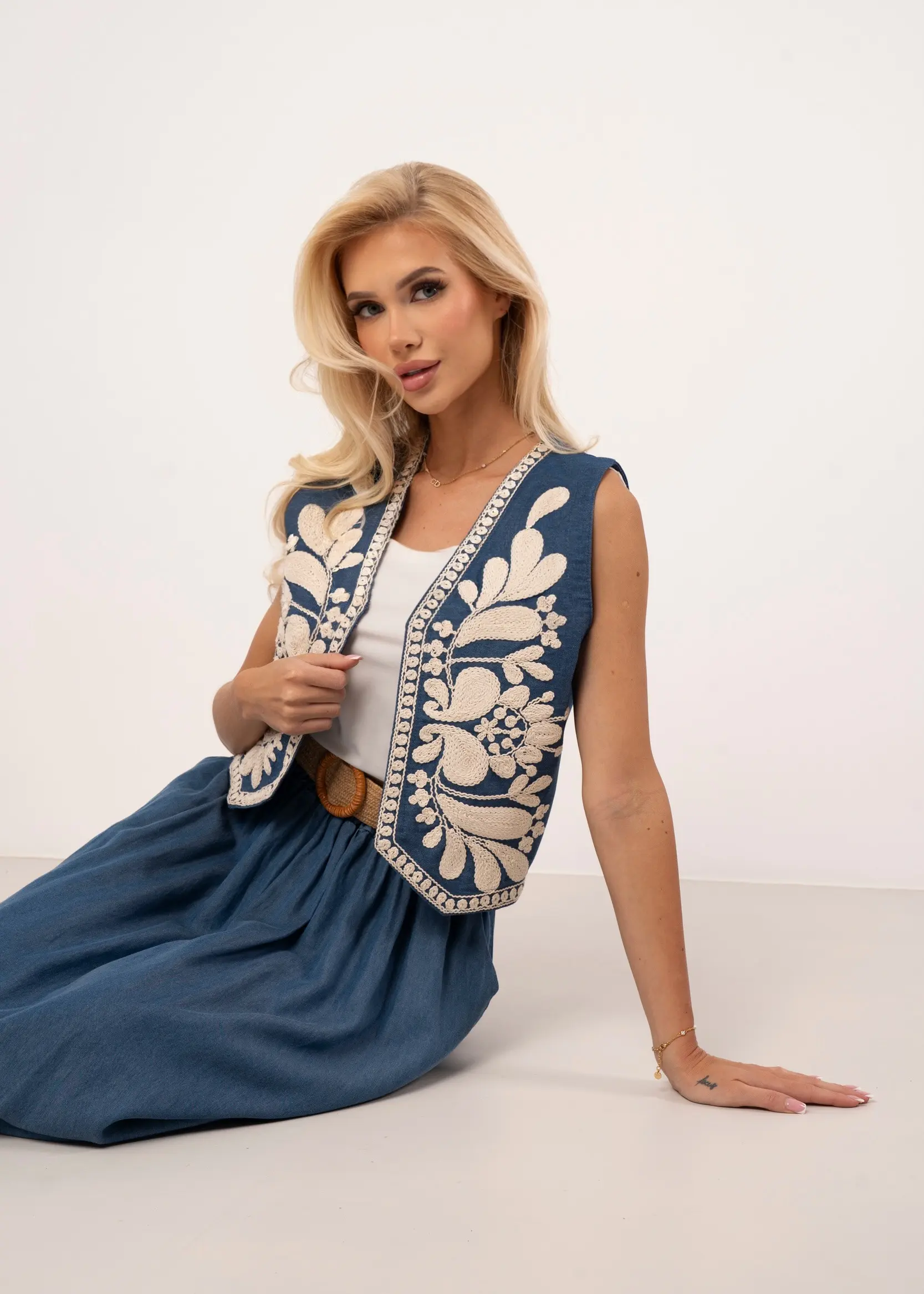 Krótka kamizelka wykonana z bawełnianej tkaniny. Model o prostym, otwartym kroju bez zapięcia, który nadaje sylwetce lekkości. Uwagę przyciągają kunsztowne, wypukłe hafty z motywem florystycznym w kontrastowym kolorze, rozmieszczone symetrycznie na przednich połach. Brzegi wykończone dekoracyjną lamówką o geometrycznym wzorze, podkreślającą etniczny charakter projektu. Idealna do warstwowych stylizacji z minimalistycznym topem lub zwiewną sukienką maxi.