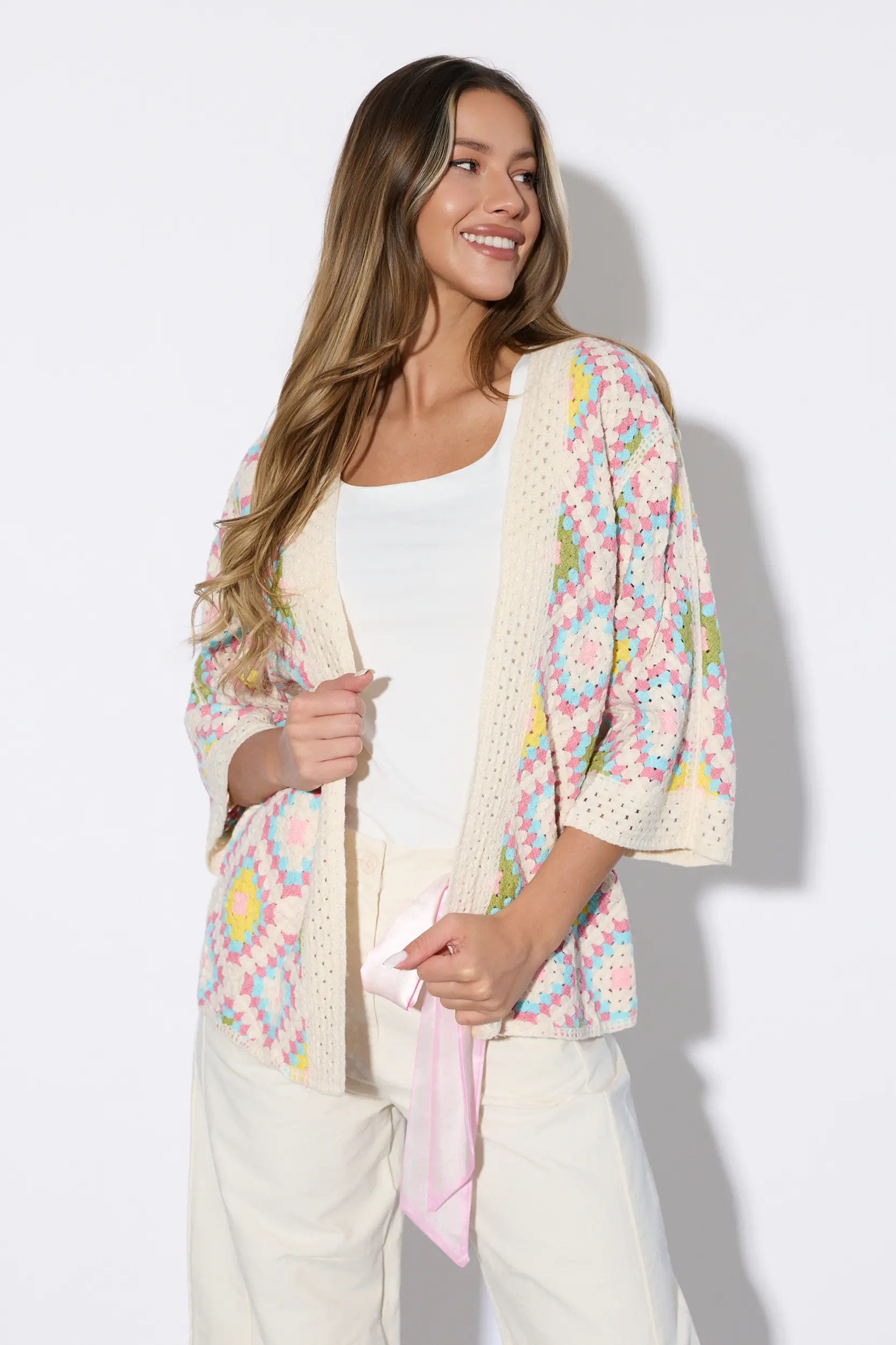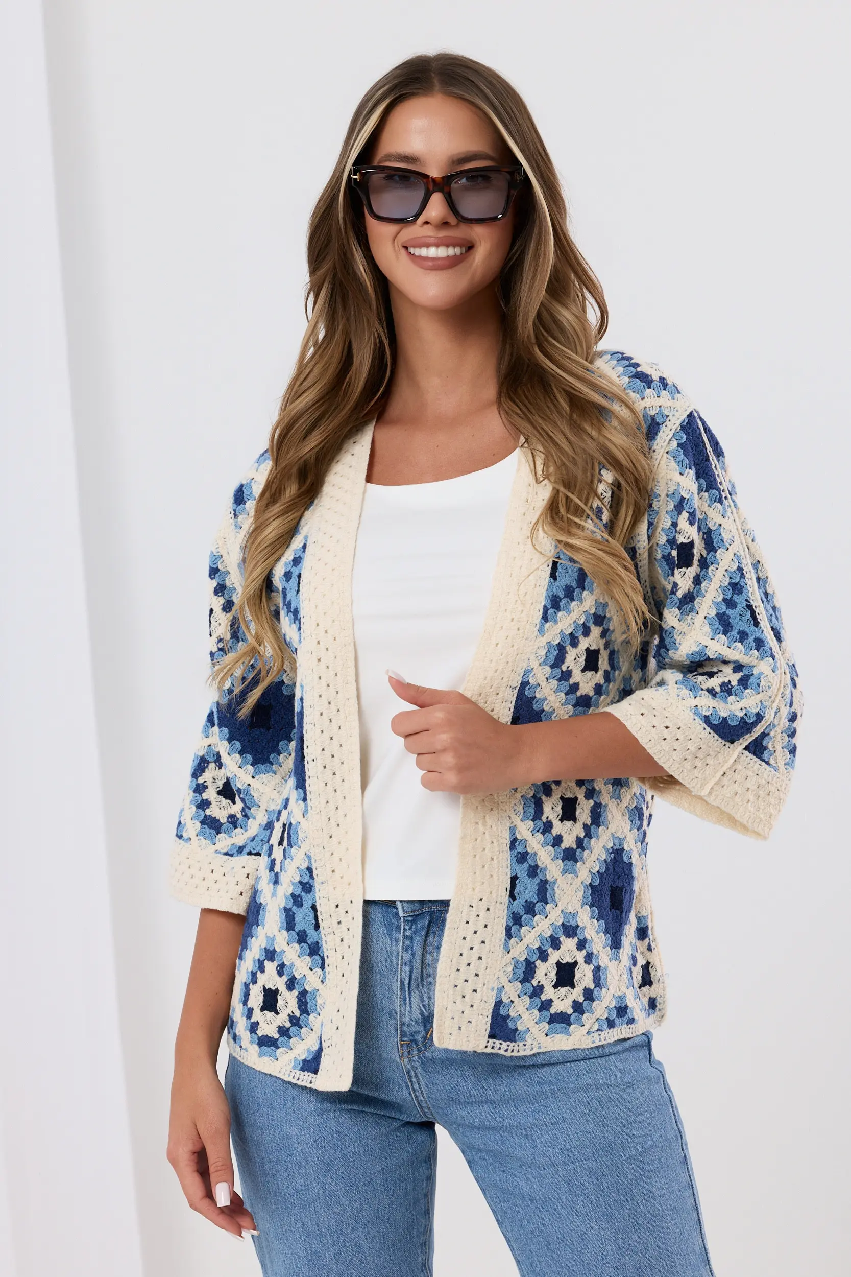 Kardigan wyróżniający się unikalnym wzorem „granny squares”, które tworzą efektowną kompozycję geometryczną. Luźny fason z szerokimi rękawami o długości 3/4 zapewnia swobodę ruchów i doskonałą przewiewność. Wykończenie brzegów szeroką, ażurową lamówką dodaje całości lekkości i klasy. Idealnie komponuje się z prostym topem i jeansami.
