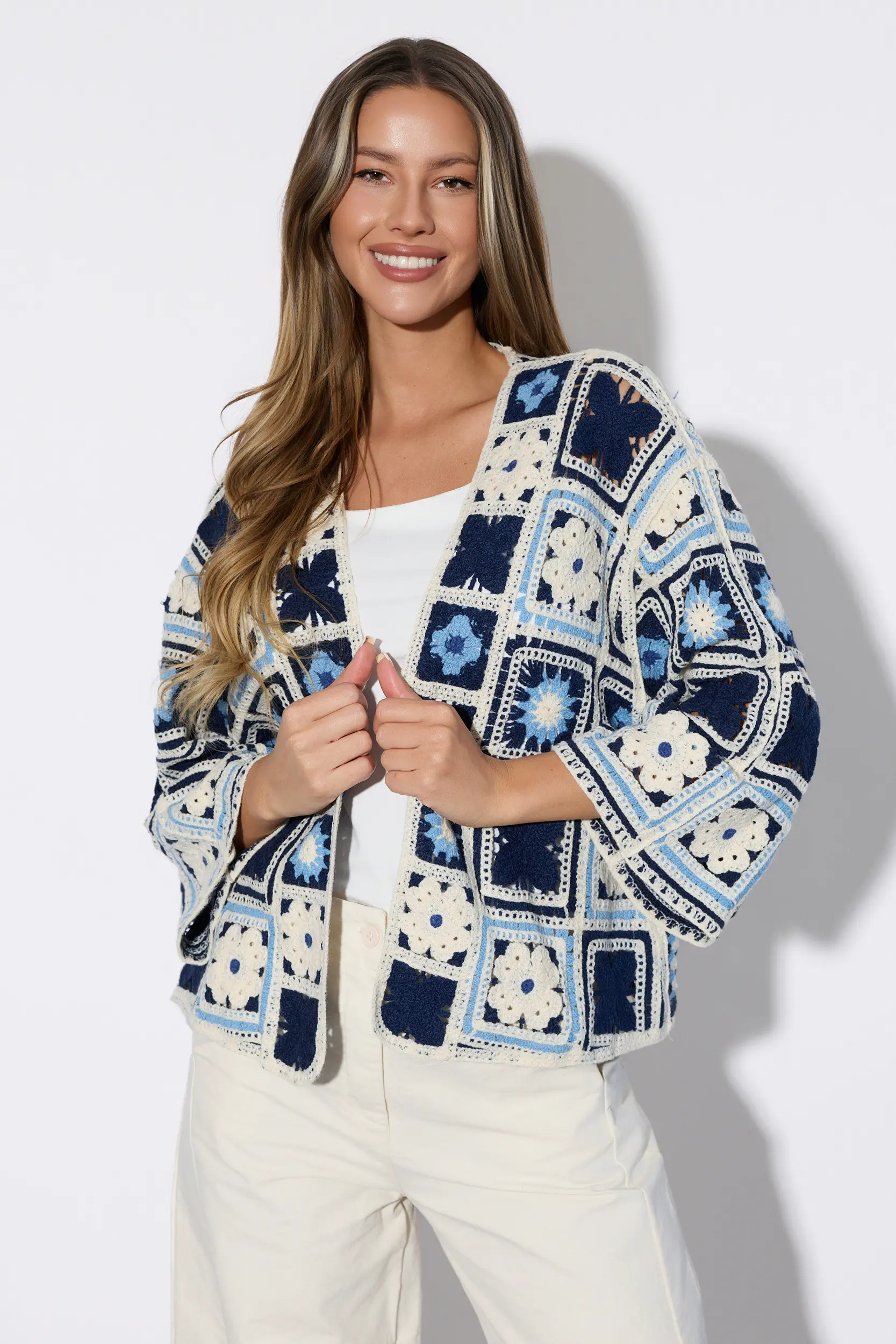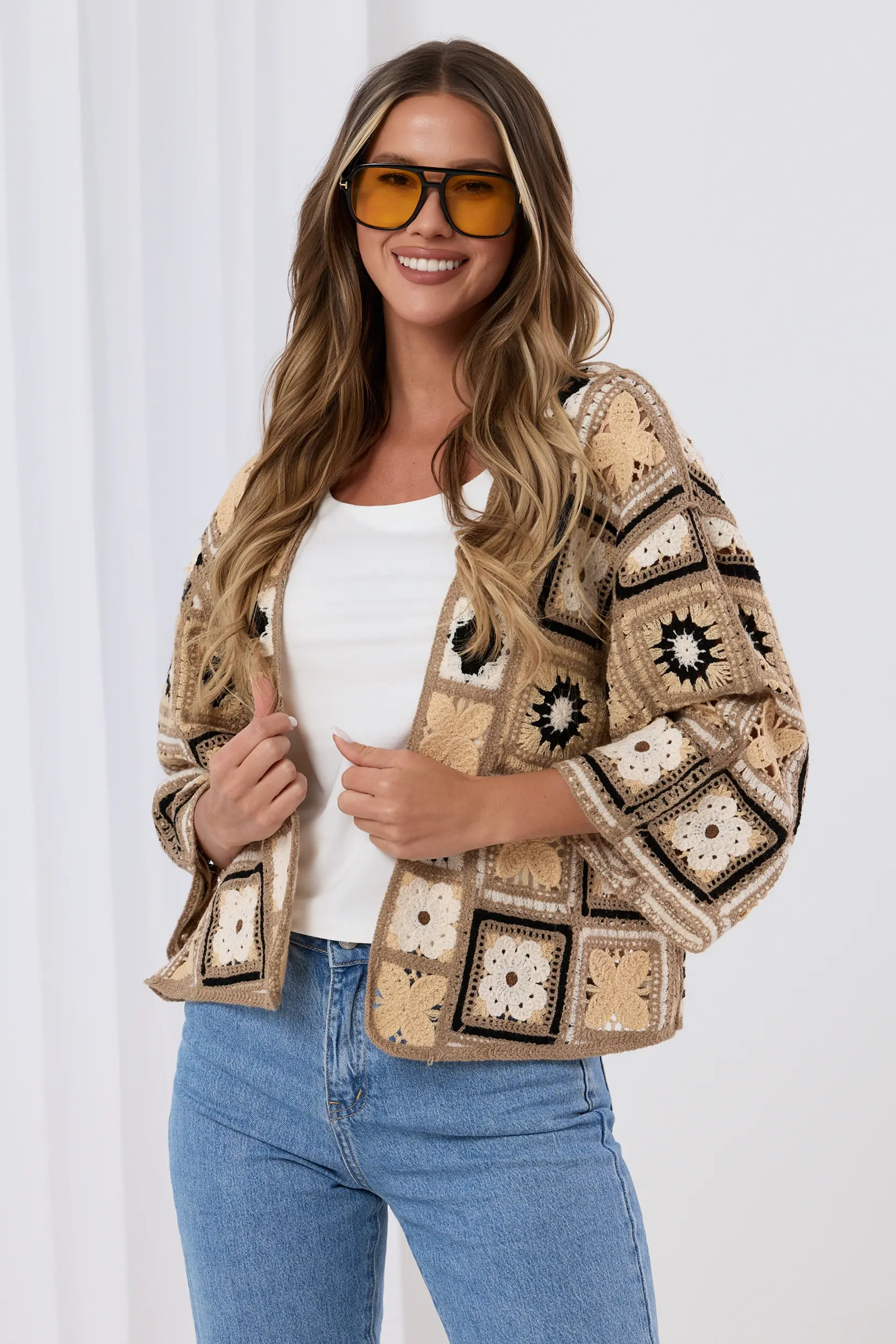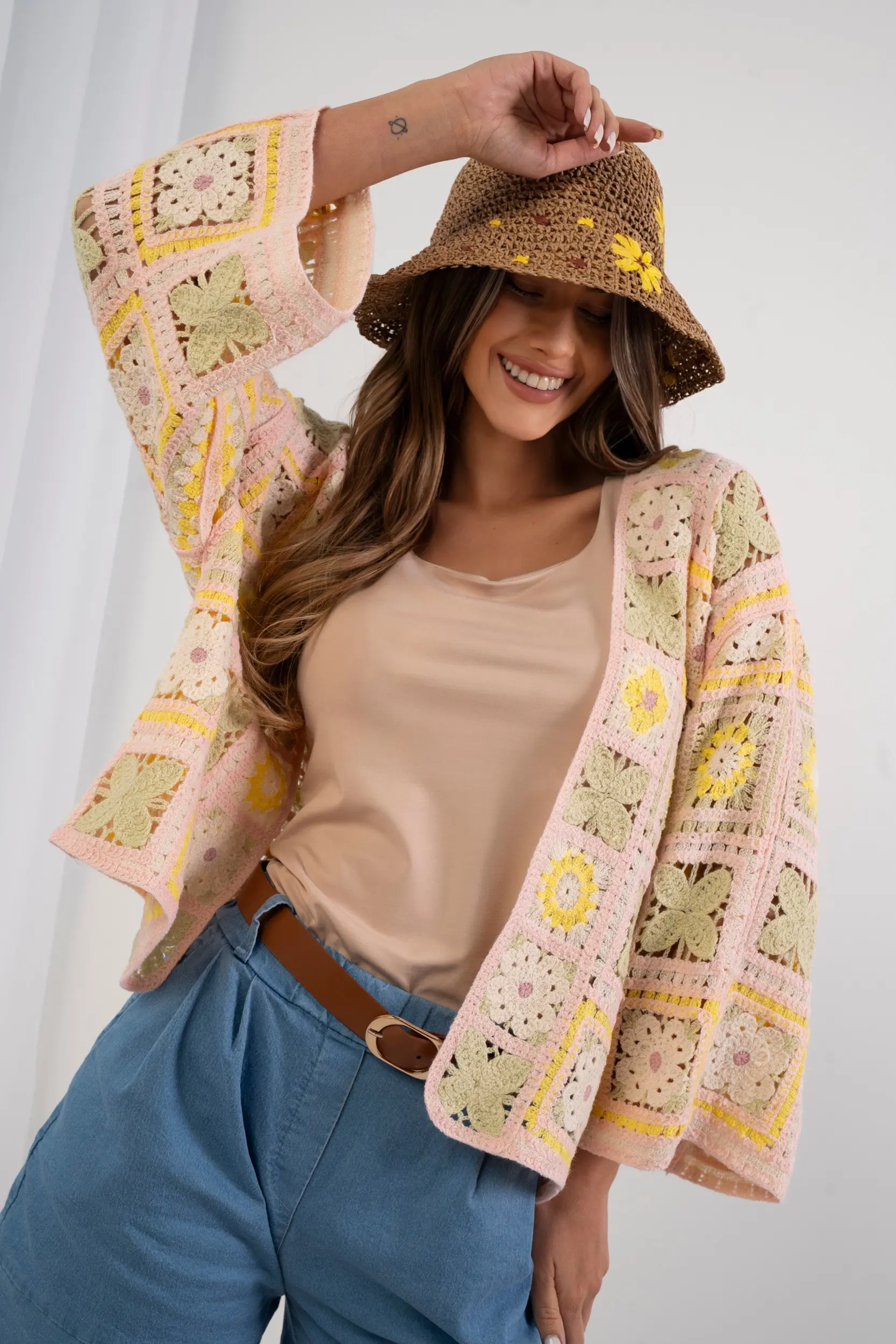 Kardigan wykonany z misternych, szydełkowych kwadratów typu granny square. Geometryczne wzory kwiatowe nadają mu unikalnego charakteru, a luźny fason z szerokimi rękawami zapewnia pełną swobodę ruchów. Krótki krój idealnie komponuje się z jeansami z wysokim stanem, tworząc look w duchu vintage. To doskonały wybór na chłodniejsze, letnie wieczory dla kobiet ceniących oryginalność.