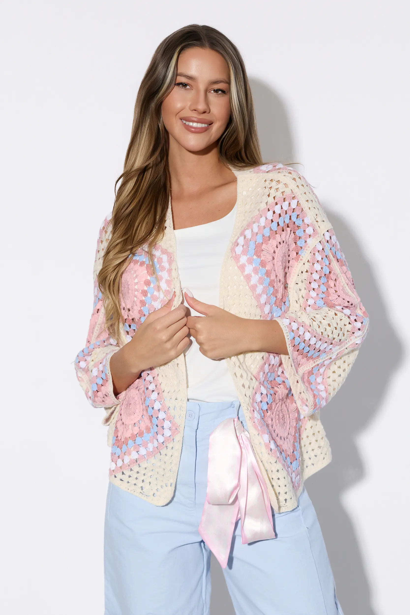 Kardigan o luźnym kroju wykonany z dzianiny o szydełkowym splocie. Model z szerokim rękawem o długości siedem ósmych. Zdobiony dużymi motywami kwiatowymi typu granny square w kontrastowych odcieniach. Brzegi wykończone ażurową lamówką. Lekki, transparentny splot nadaje całości rzemieślniczy charakter w estetyce boho. Idealny do warstwowych stylizacji z minimalistycznym topem i spodniami z wysokim stanem.