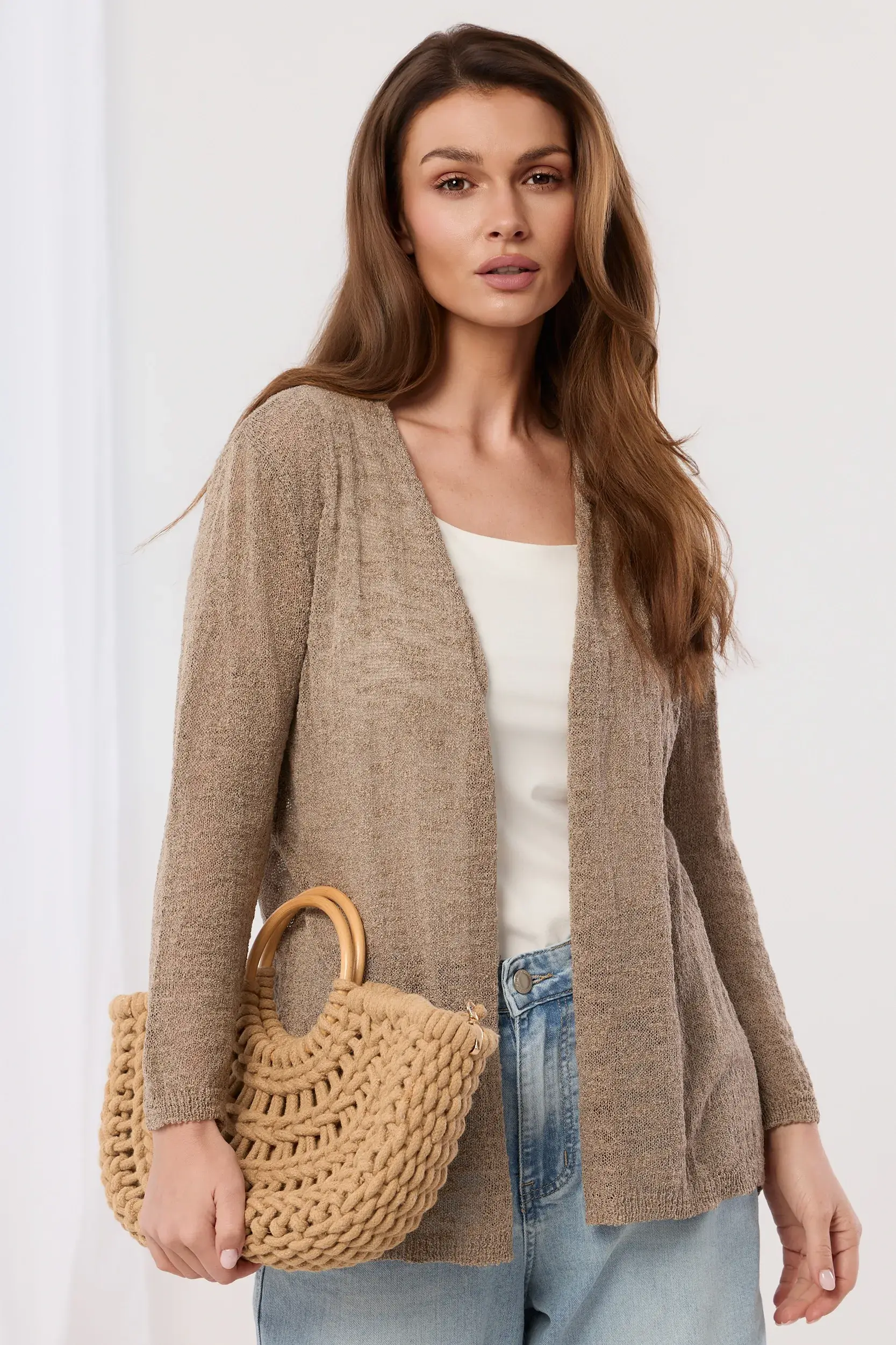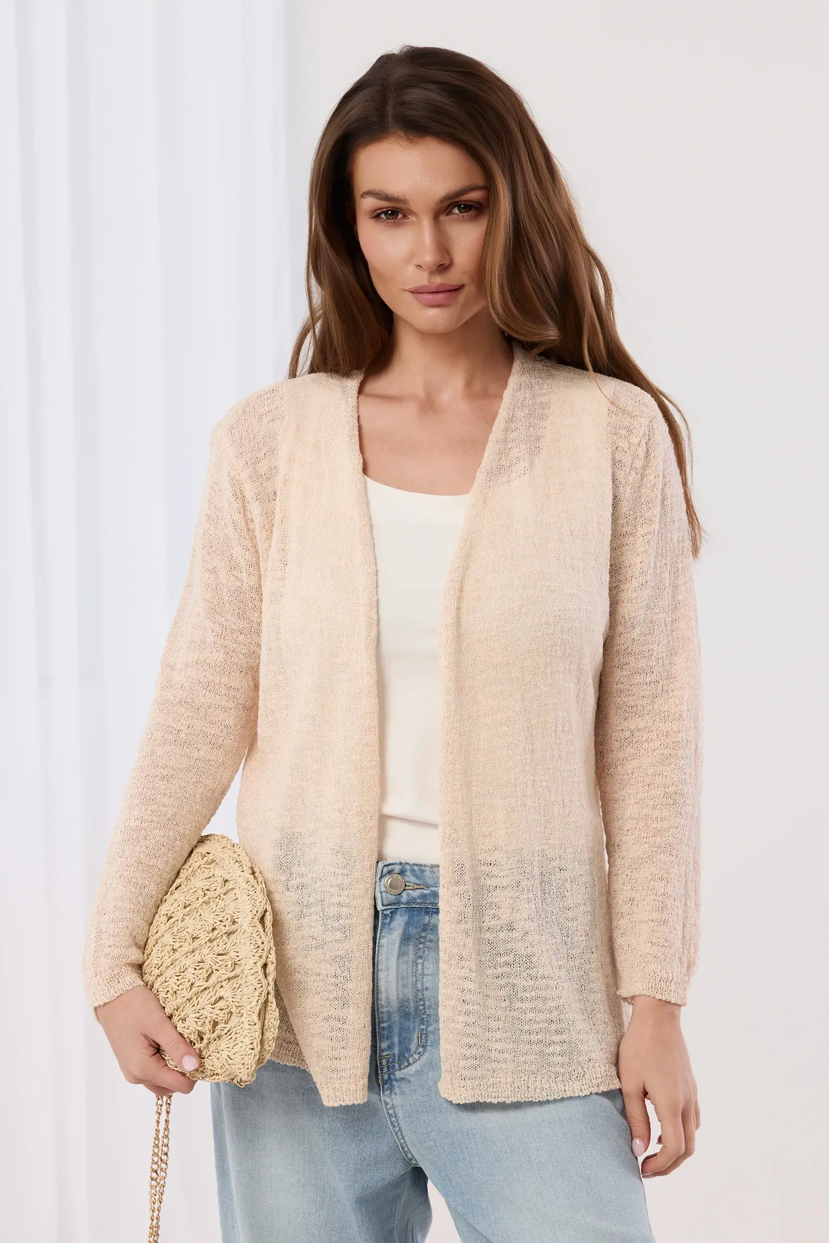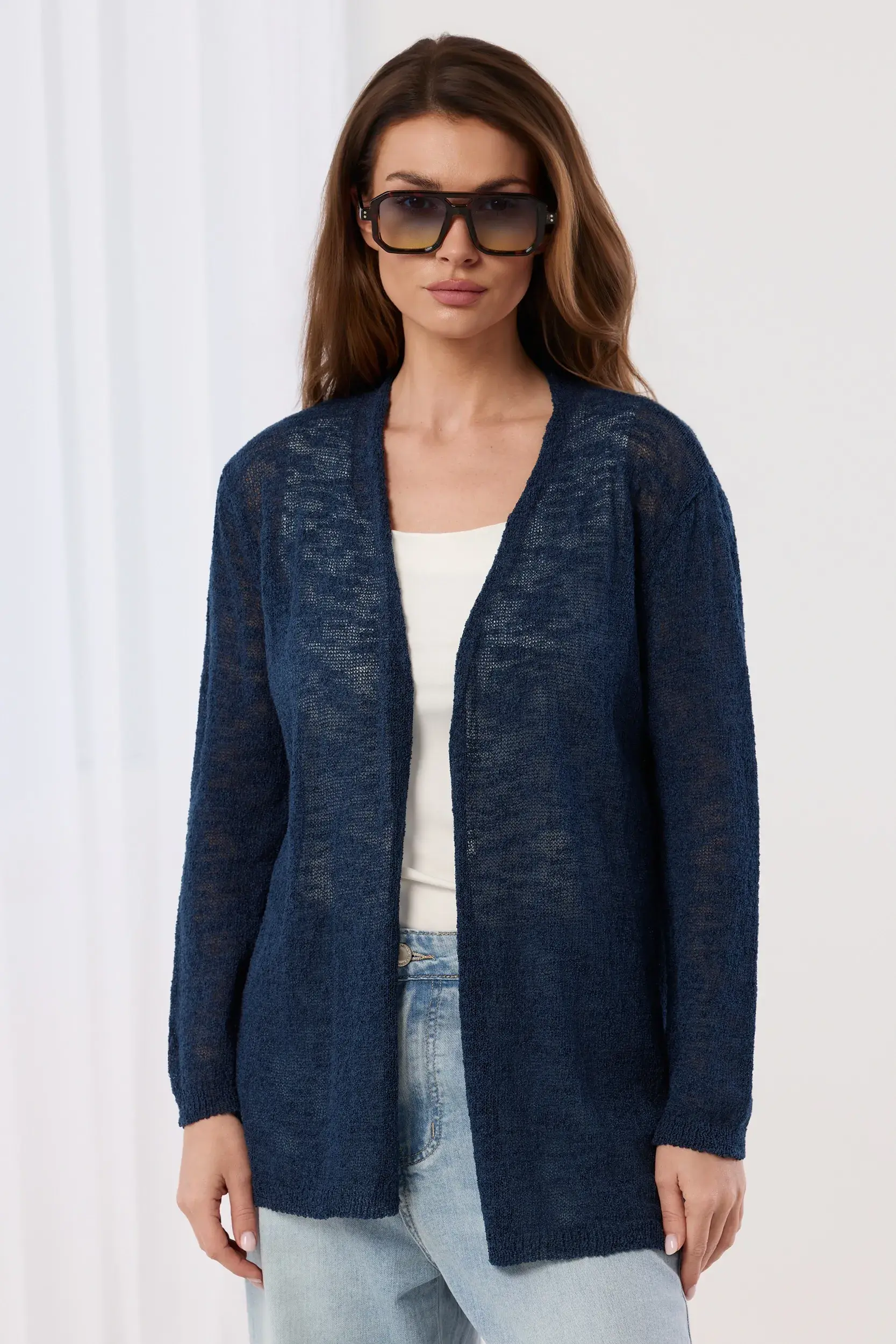 Kardigan o swobodnym kroju wykonany z lekkiej i przyjemnej w dotyku dzianiny o wyraźnym splocie. Model z długim rękawem oraz obniżoną linią ramion, która nadaje sylwetce nowoczesny, nieformalny charakter. Otwarty przód bez zapięcia sprawia, że produkt idealnie sprawdza się jako warstwa wierzchnia w zestawieniach typu basic. Wykończenie brzegów subtelnym ściągaczem podkreśla dbałość o detale i zapewnia trwałość formy. Minimalistyczny design i teksturalna struktura materiału czynią go ponadczasowym elementem garderoby, doskonale komponującym się zarówno z denimem, jak i eleganckimi spodniami.