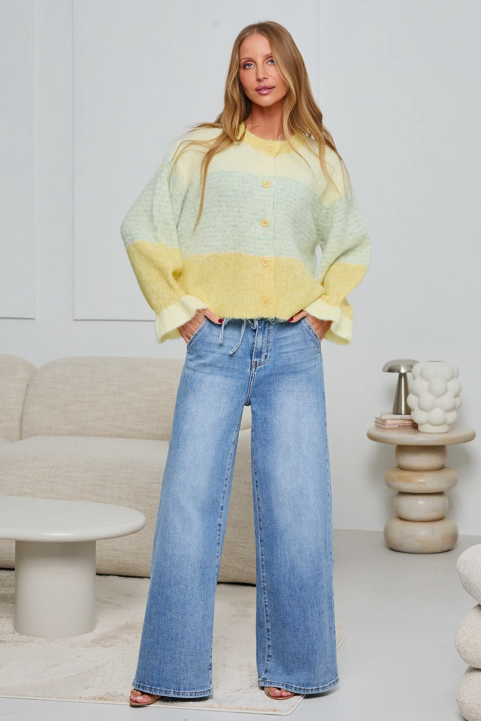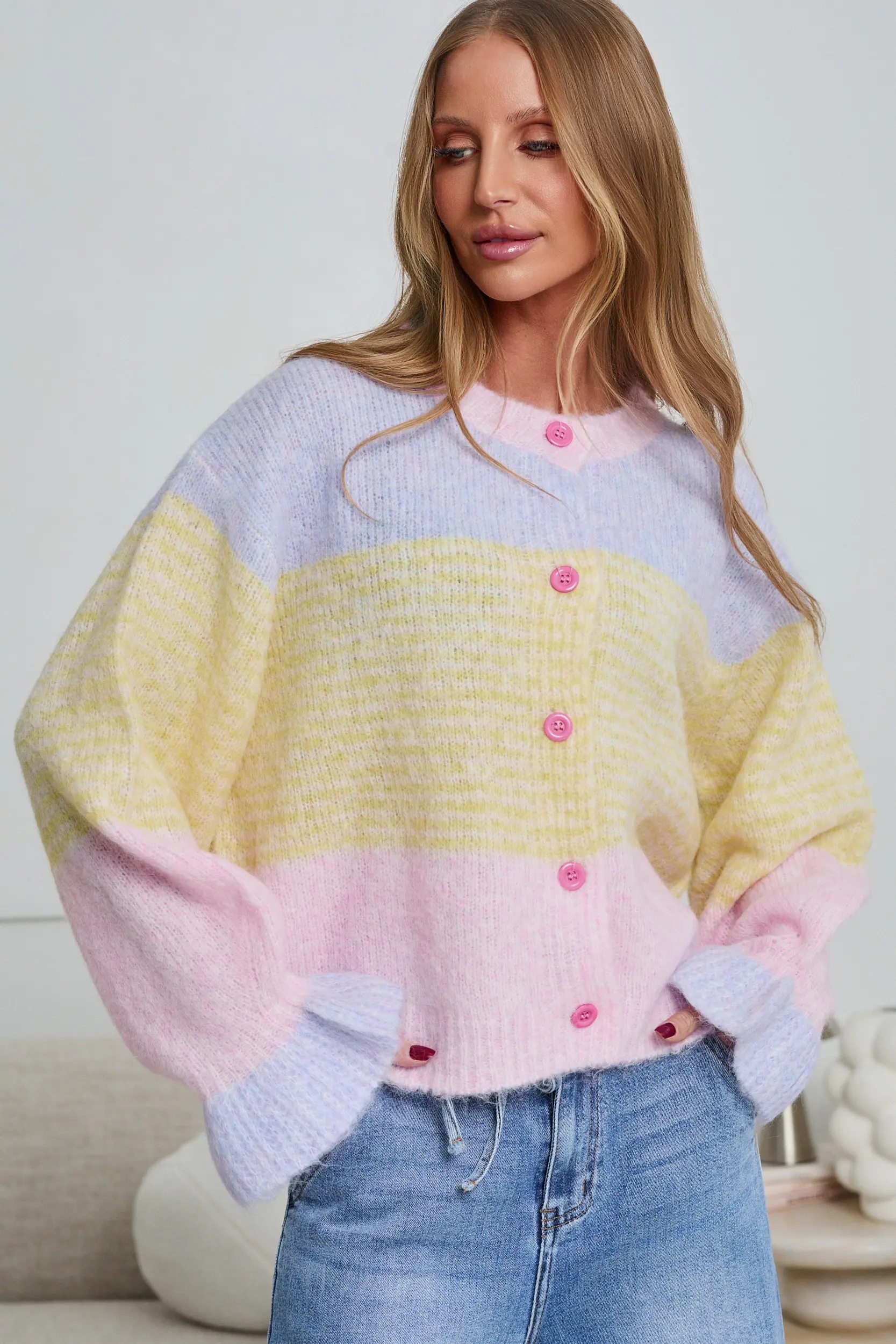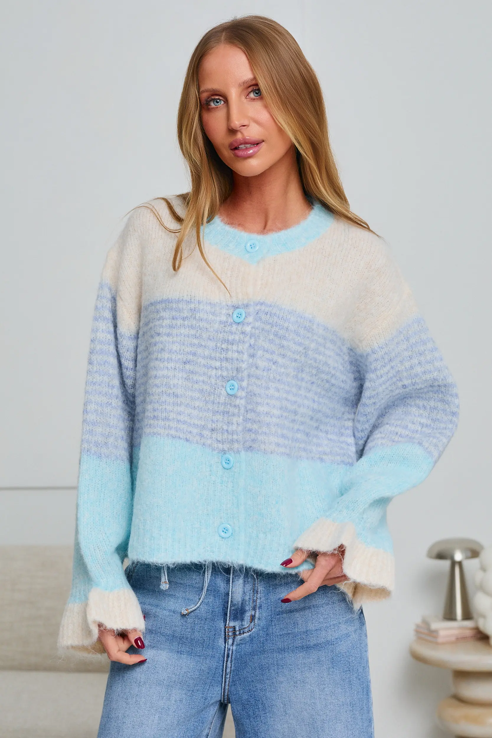 Oversizowy kardigan wykonany z miękkiej, puszystej dzianiny w pastelowej, pasiastej kolorystyce. Luźny krój z obniżoną linią ramion zapewnia swobodę i lekkość noszenia. Charakterystyczne balonowe rękawy zostały wykończone szerokimi, prążkowanymi mankietami w kontrastowym odcieniu, które subtelnie podkreślają formę. Model zapinany na guziki, z klasycznym, okrągłym dekoltem. Idealny do codziennych stylizacji — noszony z jeansami, spodniami z wysokim stanem lub narzucony na prosty top.