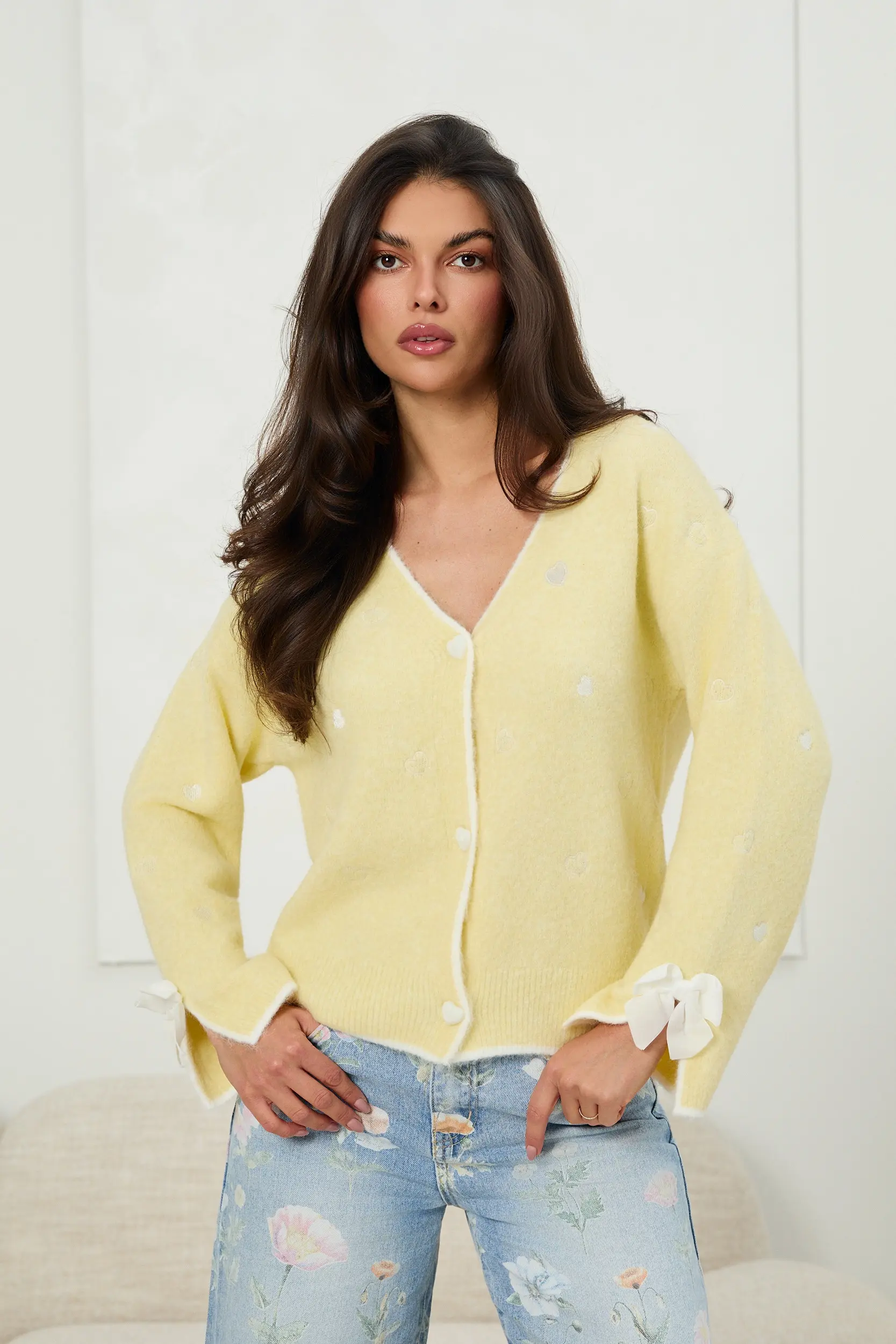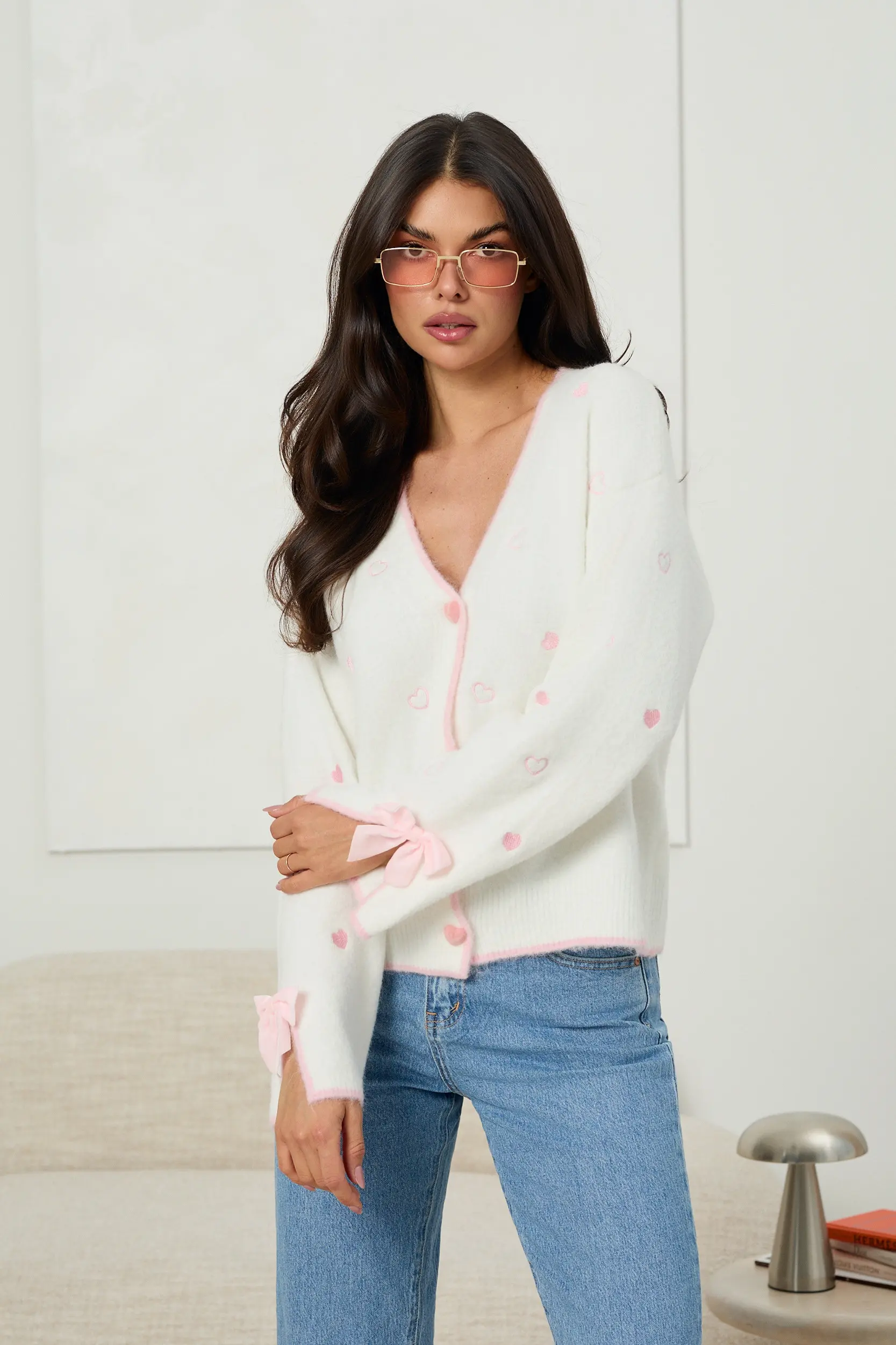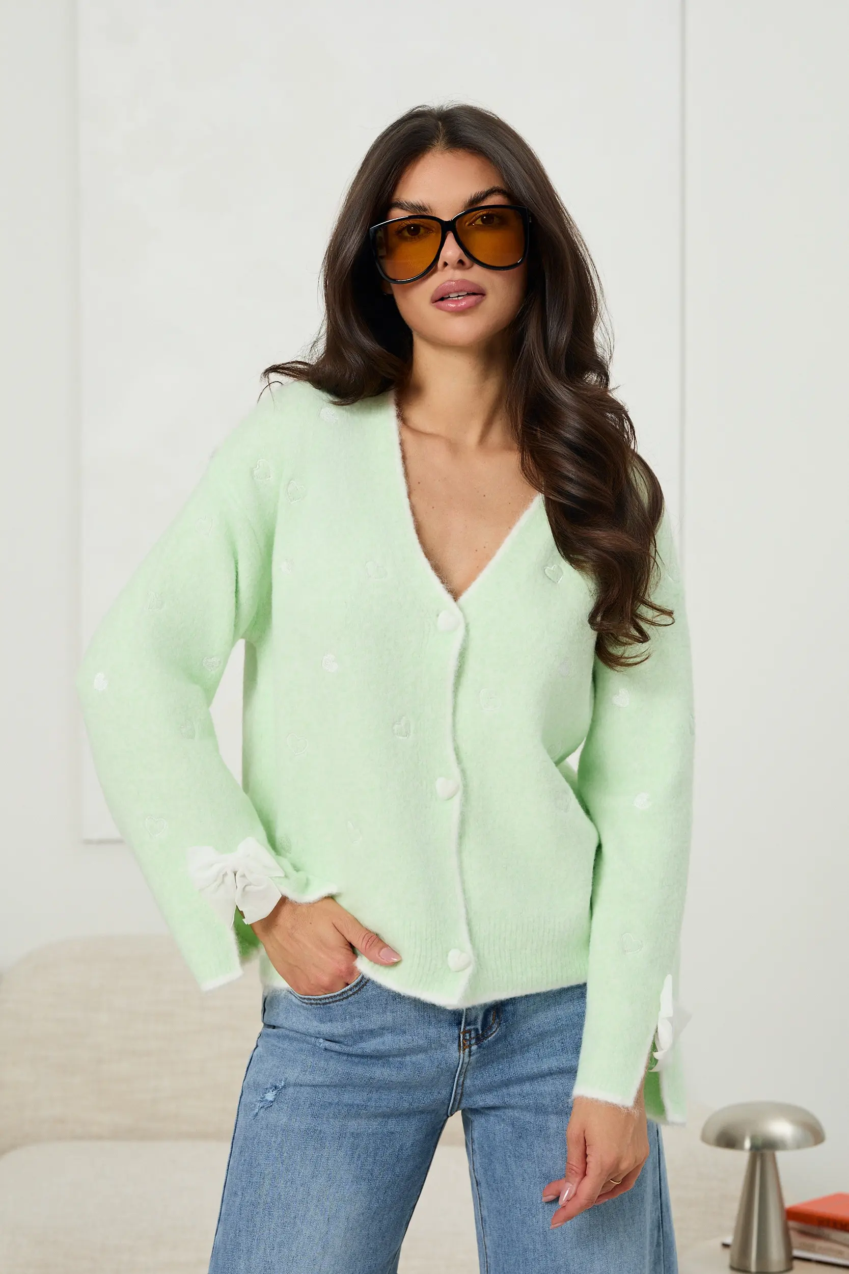 Kardigan o kobiecym charakterze z subtelnymi haftowanymi motywami serc na całej powierzchni. Model zapinany na guziki w kształcie serc, z dekoltem w serek. Szerokie rękawy zakończone rozcięciem, ozdobione delikatnymi kokardkami, nadają całości lekkości i dekoracyjnego akcentu. Prosty, lekko luźny krój sprawia, że kardigan dobrze układa się na sylwetce i sprawdzi się zarówno w codziennych stylizacjach, jak i w bardziej dopracowanych zestawach.